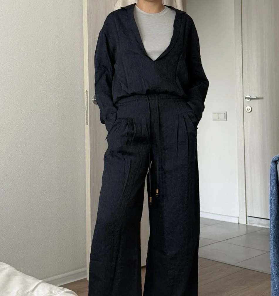 Discover effortless style with the Autumn Vacation Loose Set. This chic two-piece ensemble features a flattering V-neck top and comfortable wide-leg pants, perfect for casual outings or relaxed evenings.