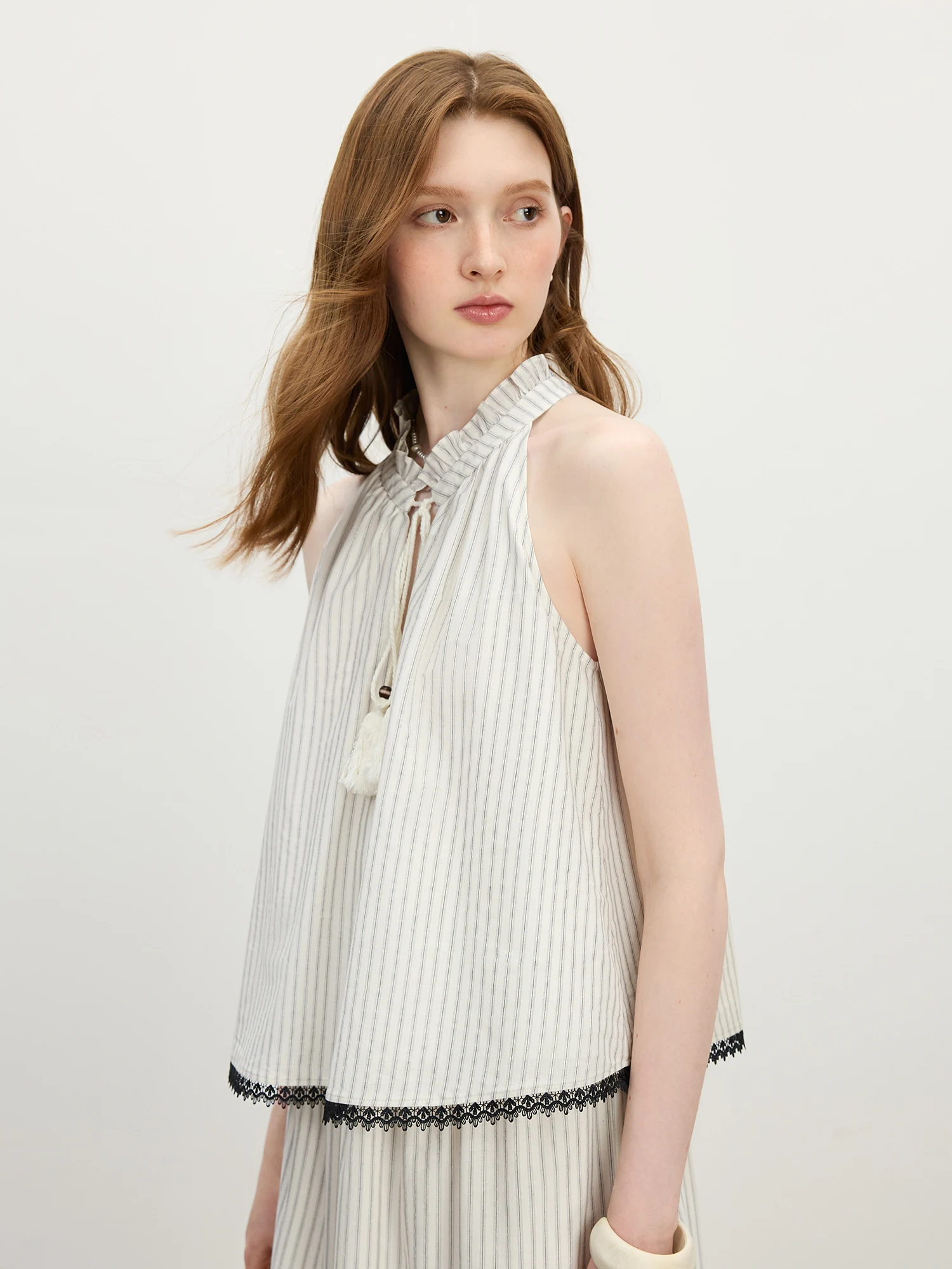 - Sleeveless halterneck top with a crew neckline and pullover closure.