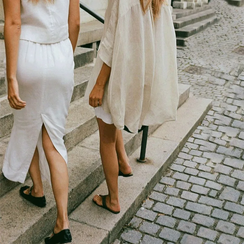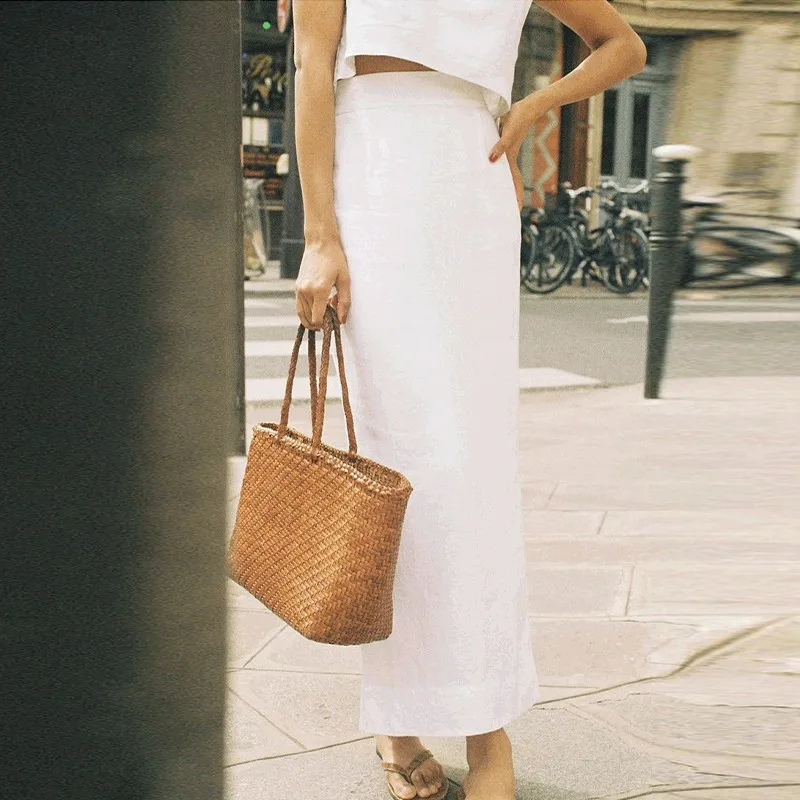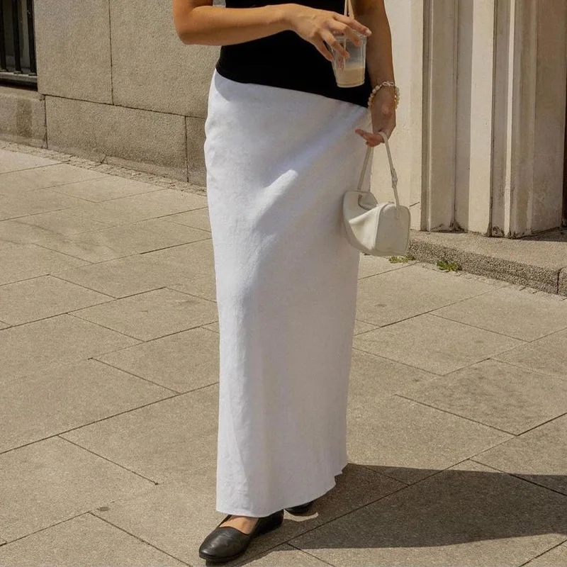 Experience effortless elegance with this 100% linen straight skirt, designed for a chic summer look. The high waist and back split add sophistication, while the ankle-length silhouette flatters every figure. Crafted from breathable cotton linen, it promises comfort and style for any occasion. Embrace a minimalist aesthetic that exudes luxury and confidence. Perfect for a relaxed day out or a refined evening event. Available in classic white and black, this skirt is a versatile addition to your wardrobe.