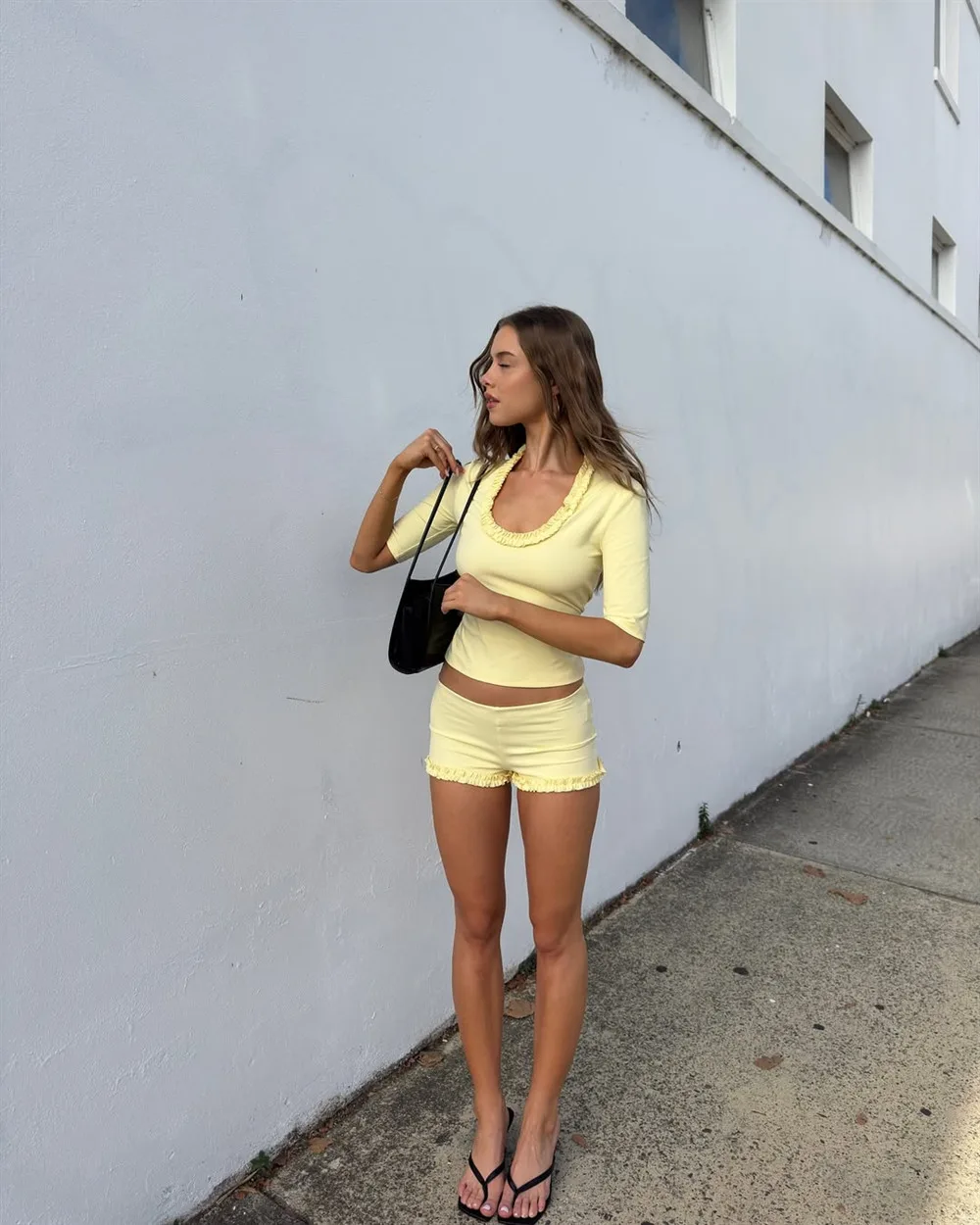 This ruffled shorts set brings a fresh, sophisticated edge to your warm-weather wardrobe. The light yellow hue radiates sunshine and positivity, while the thoughtfully designed U-neck tee and coordinated shorts create a polished, put-together look in seconds. Perfect for those who appreciate effortless style with a contemporary twist, this ensemble transitions seamlessly from leisurely mornings to evening gatherings, making it an essential addition to your seasonal collection.
