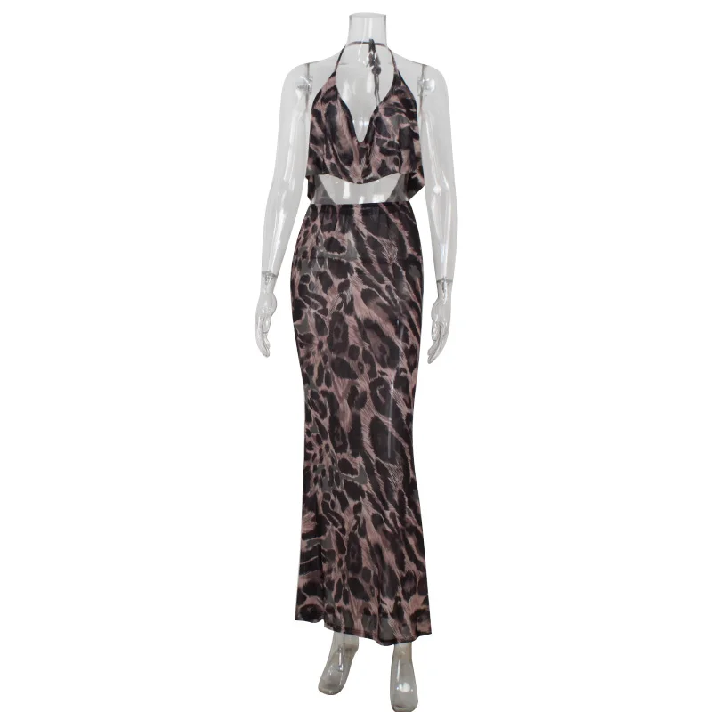 Sophisticated halter backless beach set featuring a flowing chiffon top and floor-length printed skirt. This two-piece ensemble offers effortless resort elegance with its V-neck design and breathable synthetic blend. Perfect for summer getaways, the elastic waist ensures comfortable all-day wear while the statement print adds refined charm to your vacation wardrobe.