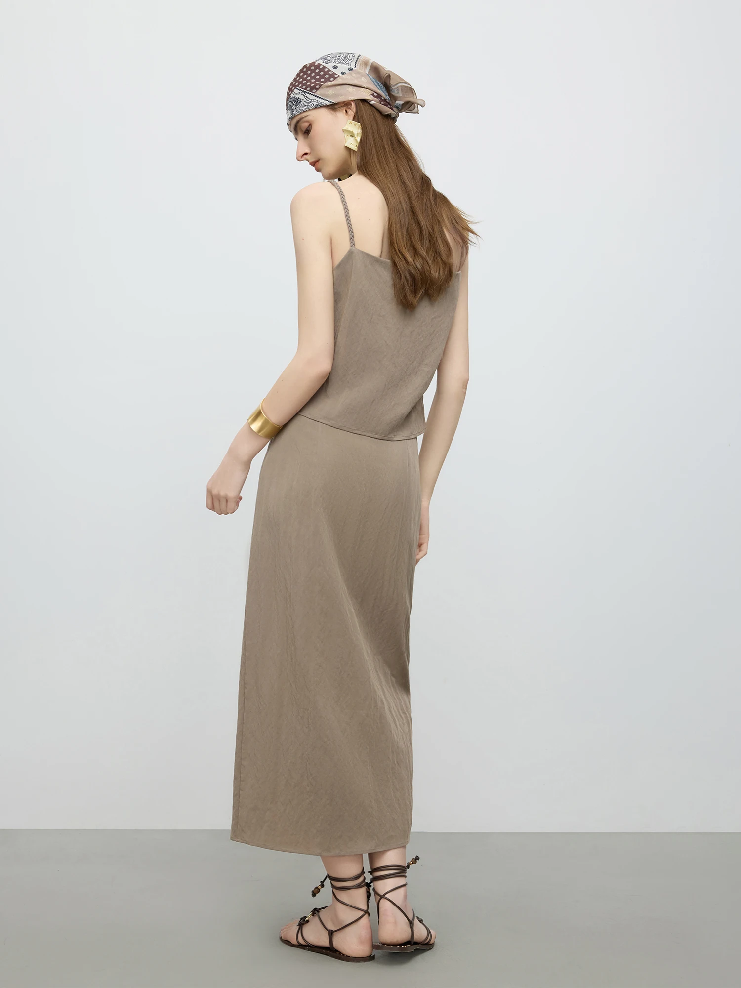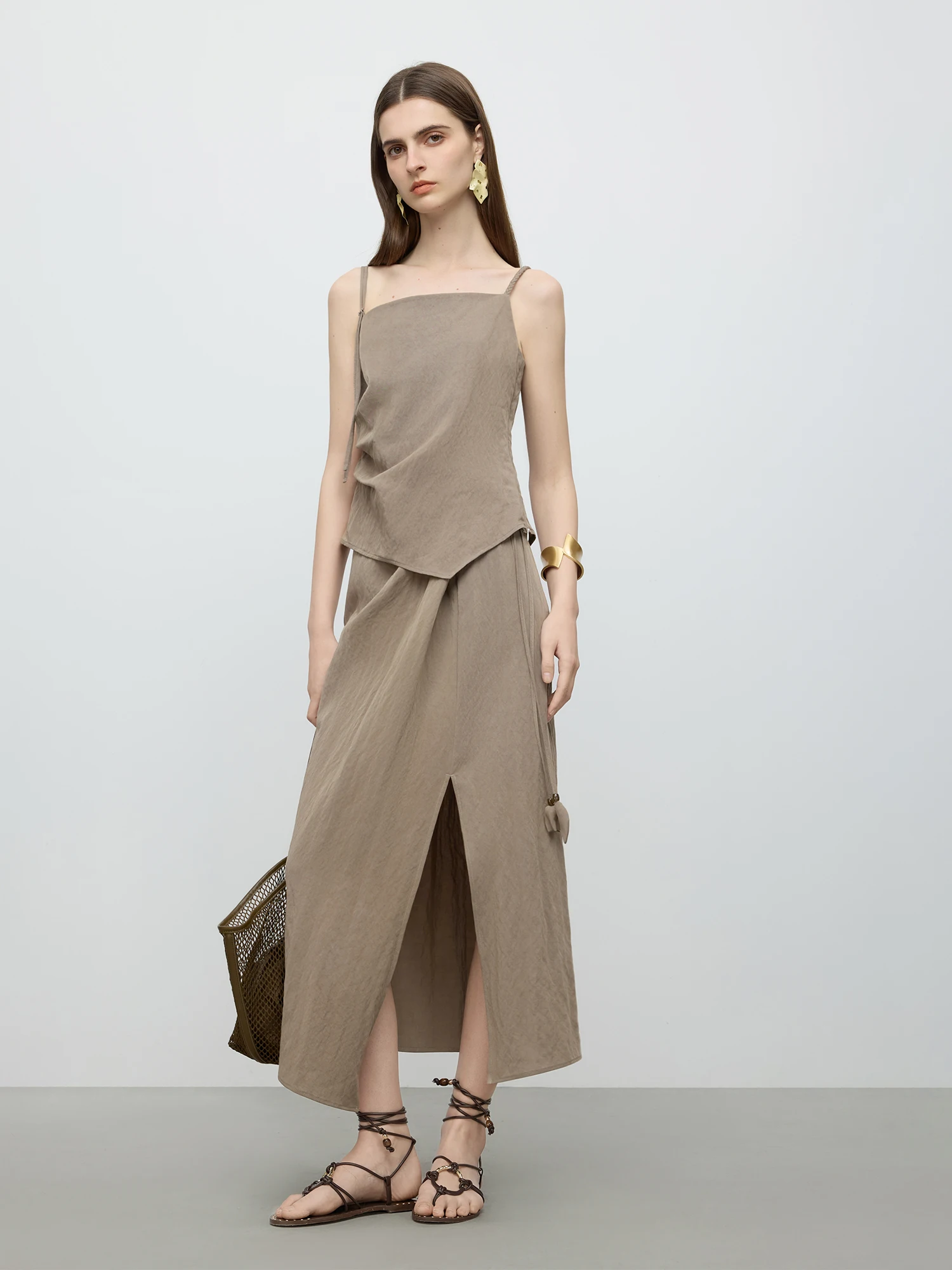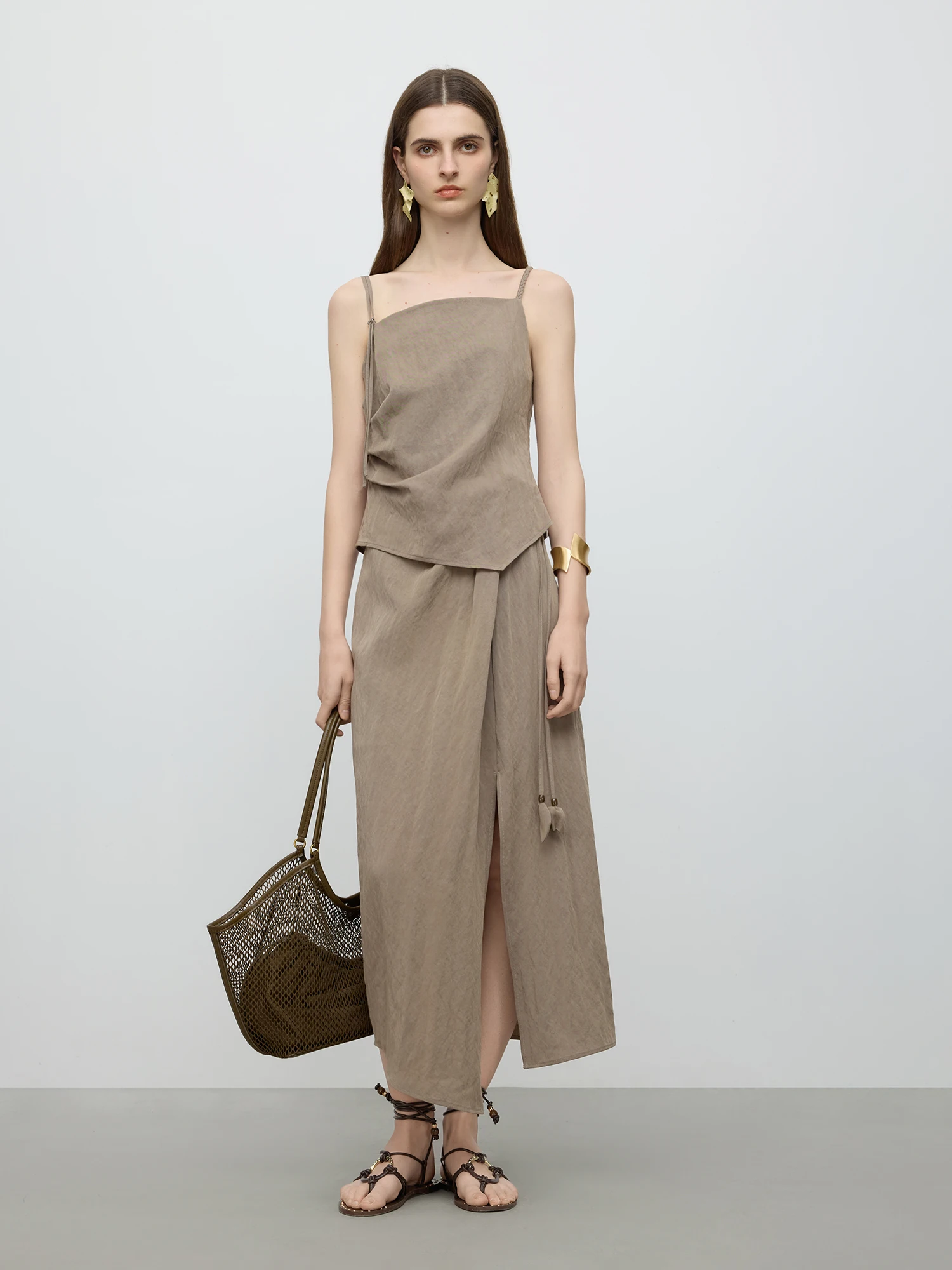 - Design: Features an asymmetrical hemline on the midi skirt paired with a sleek camisole suspender top for a minimalist silhouette.