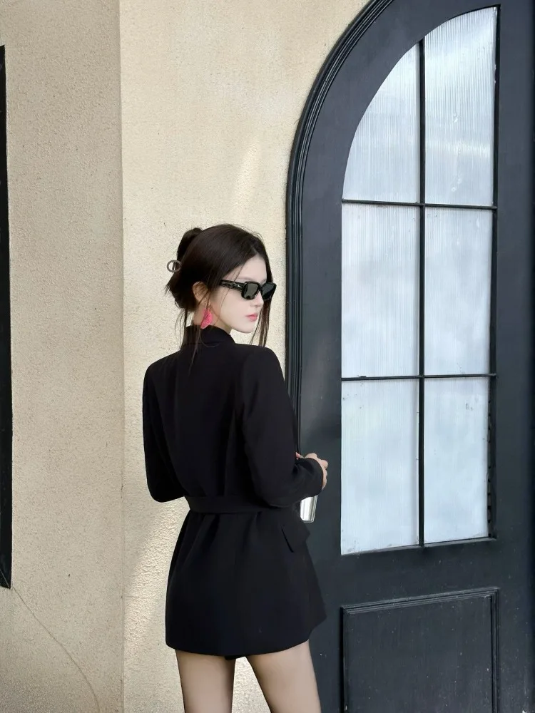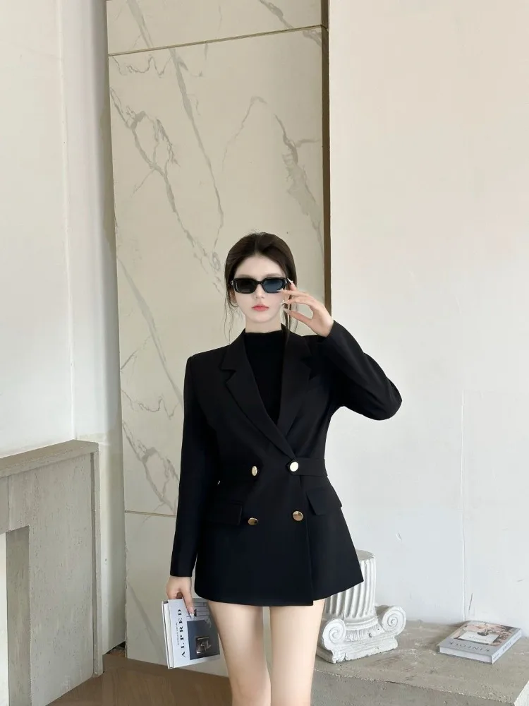Step into sophistication with our Women's Double Breasted Blazer, designed for every occasion. This elegant black blazer features a notched collar and a structured fit that flatters your silhouette. Crafted from premium synthetic fiber, it offers a comfortable feel with a slight stretch. Perfect for spring and autumn, elevate your wardrobe with this timeless piece that exudes confidence and style. Available in extended sizes for every body.