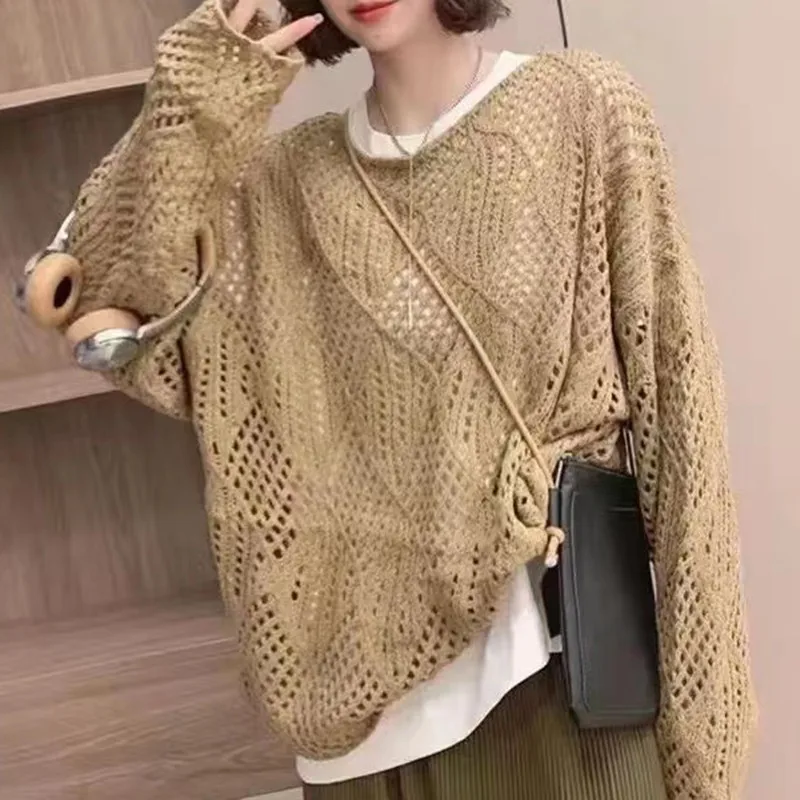 Autumn Hollow-Knit Diamond Grid Blouse with Long Sleeves