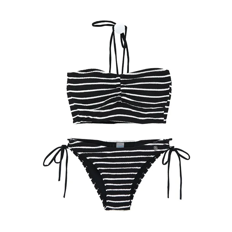 Embrace the season with this backless striped two-piece bikini set, designed for women seeking a refined yet playful swimwear option. Crafted from polyester with a slight stretch, it offers a slim fit that contours the body comfortably.