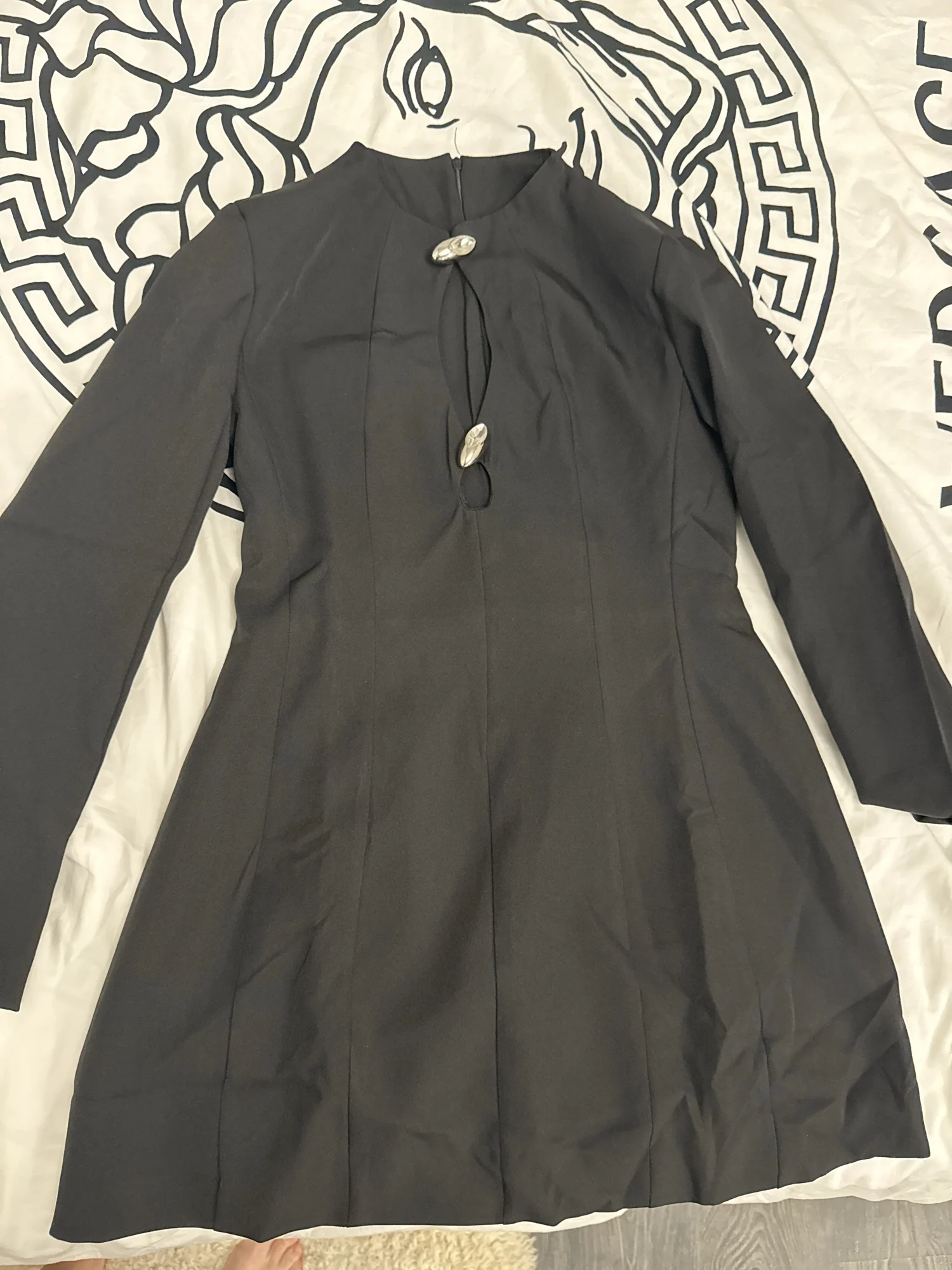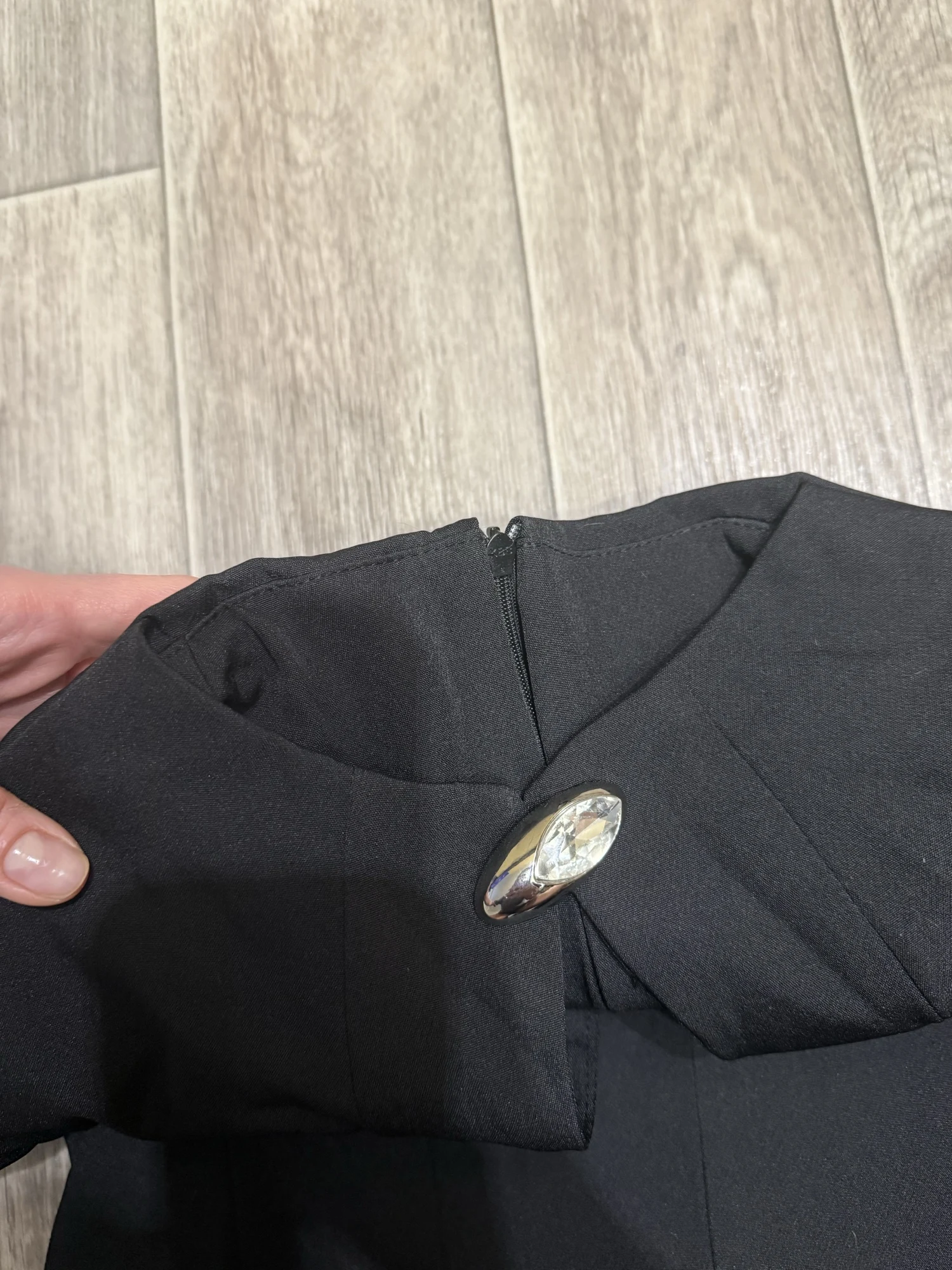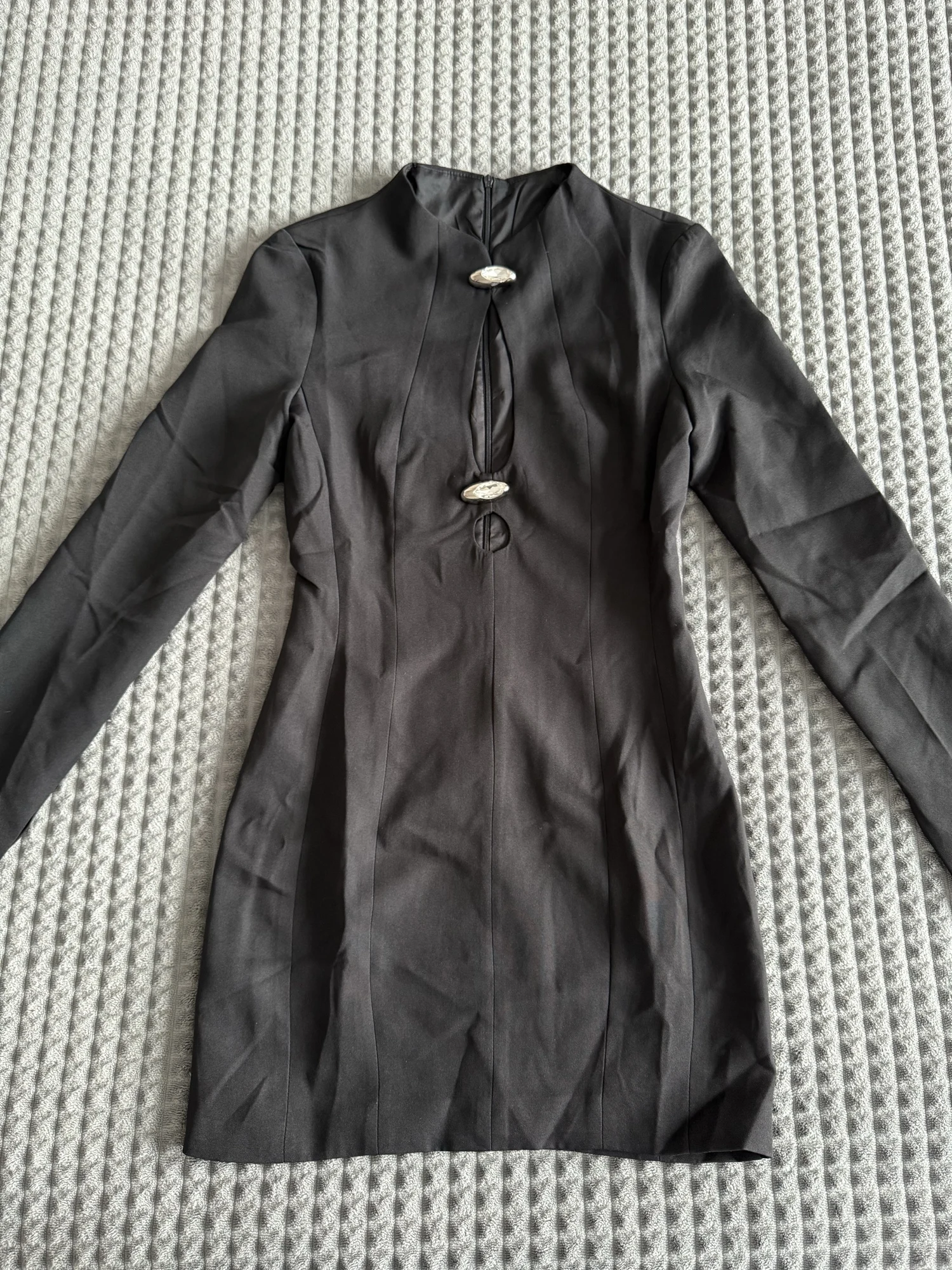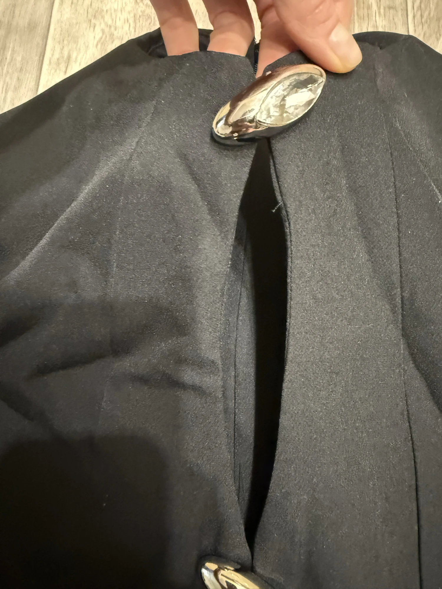 The buttons are crooked, it won't be possible to sew them straight again because they are huge and there's only one leg, they hang randomly.