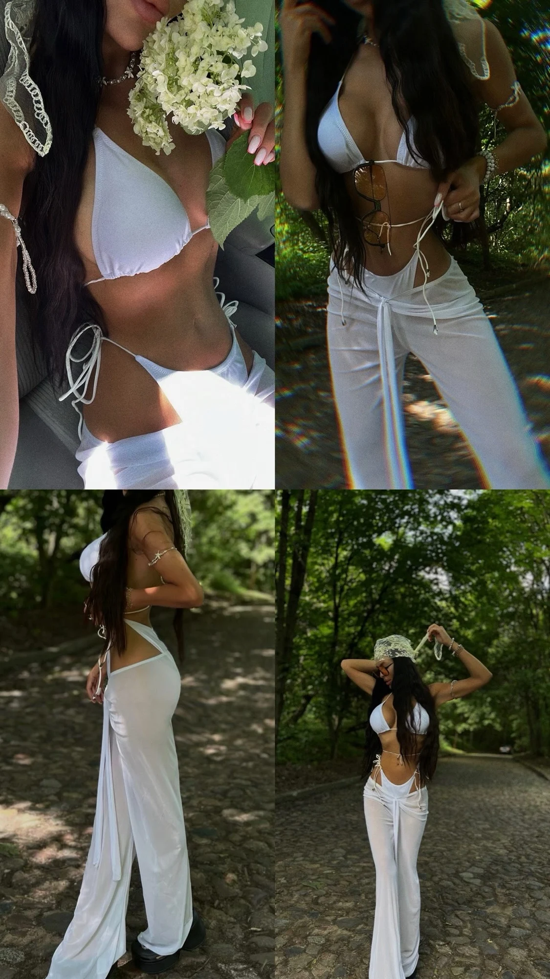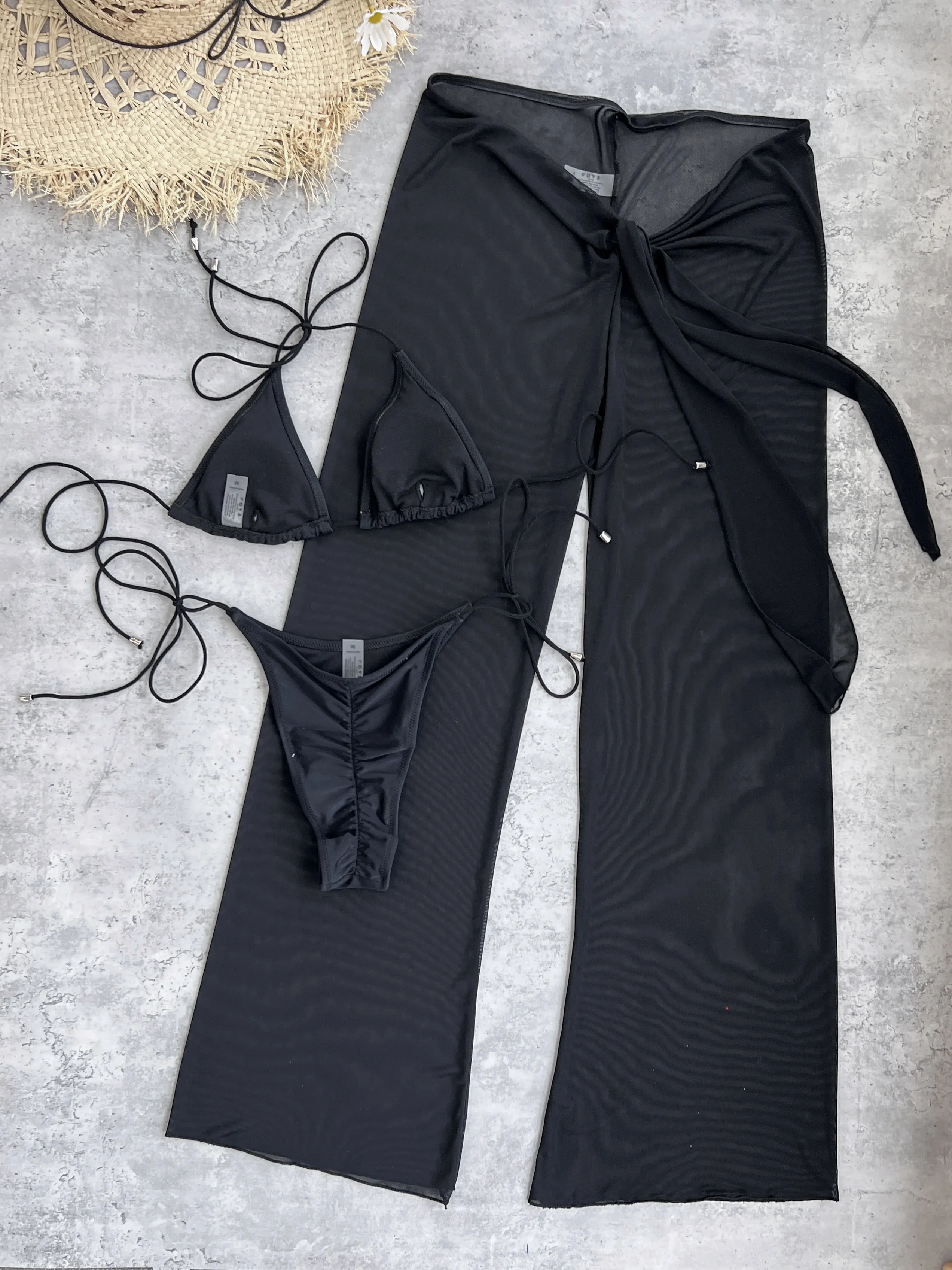 Low-waist bottom, tied on the sides. The set includes a cover-up and beach pants.