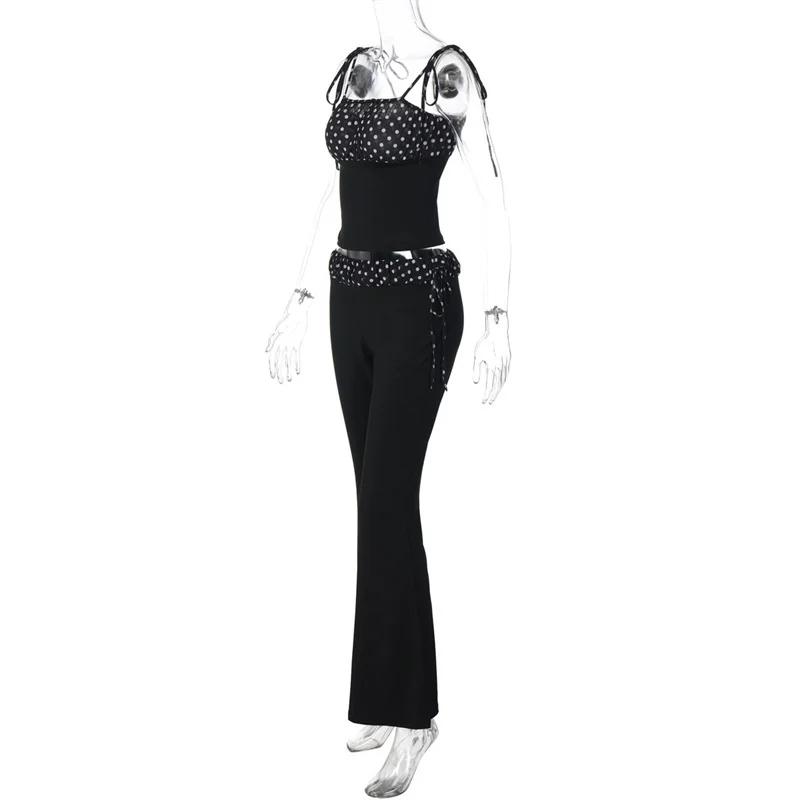 Step into timeless sophistication with this stunning two-piece ensemble that masterfully combines classic polka dot charm with contemporary silhouettes. This luxurious set features a sleek bodycon top paired with gracefully flowing wide-leg pants, creating an effortlessly flattering look that celebrates your natural beauty while delivering uncompromising comfort and style.