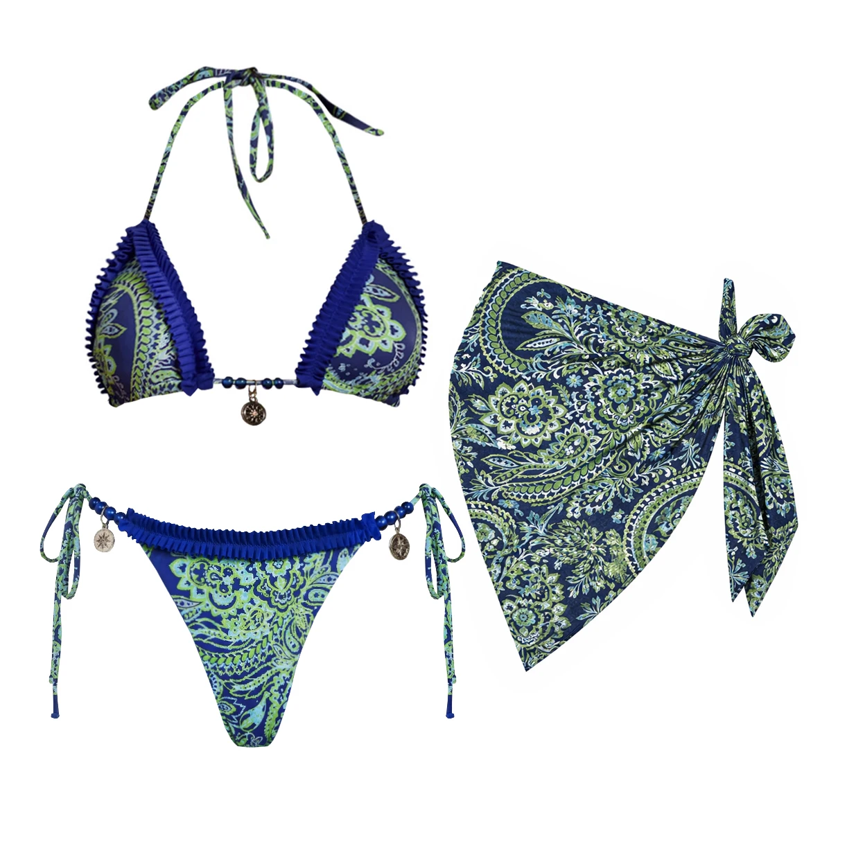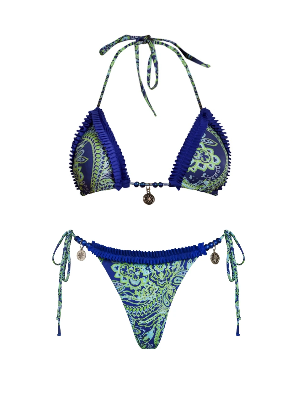Blue Green Paisley Beaded Halter Bikini Set with Metal Pendant