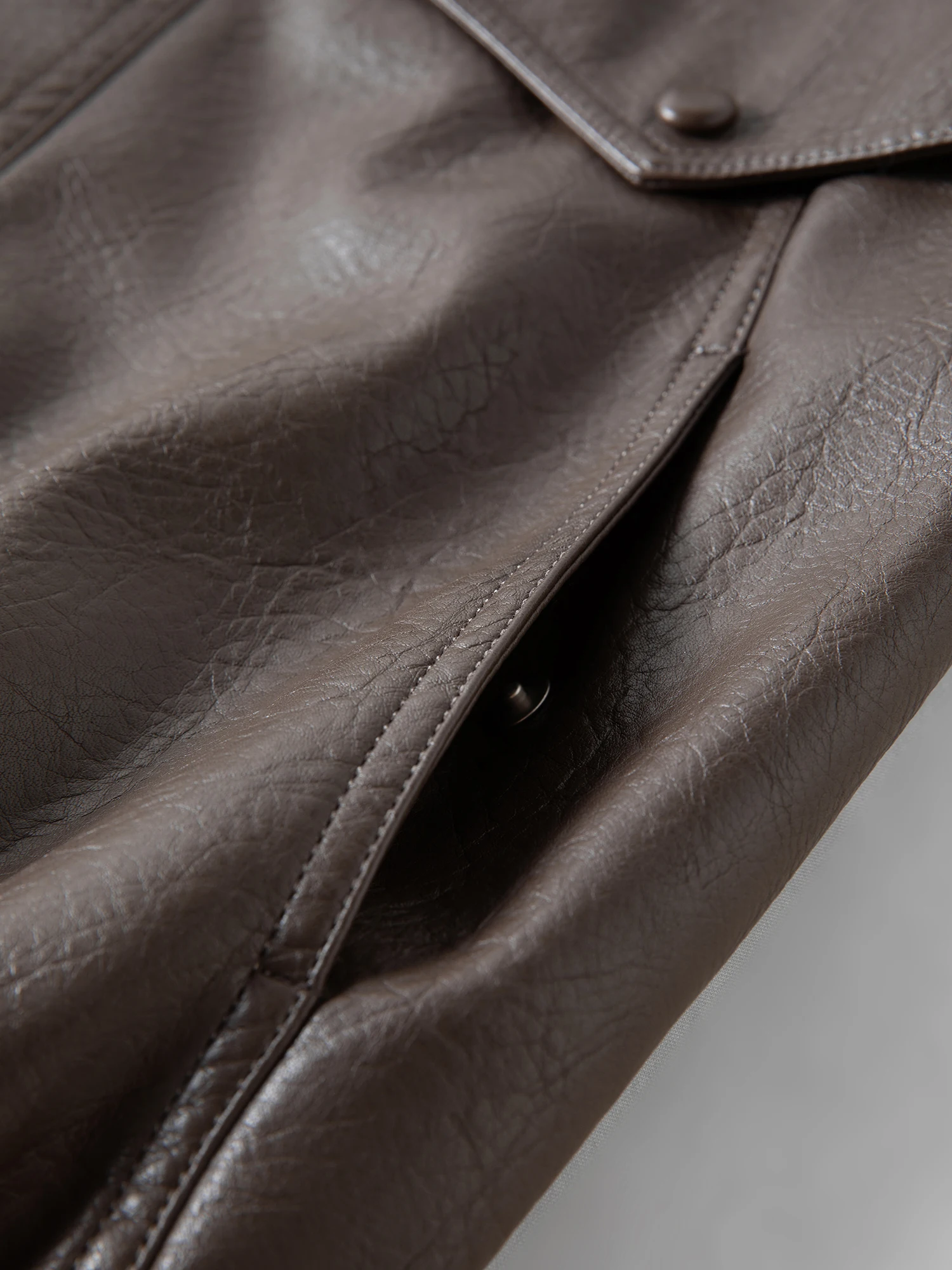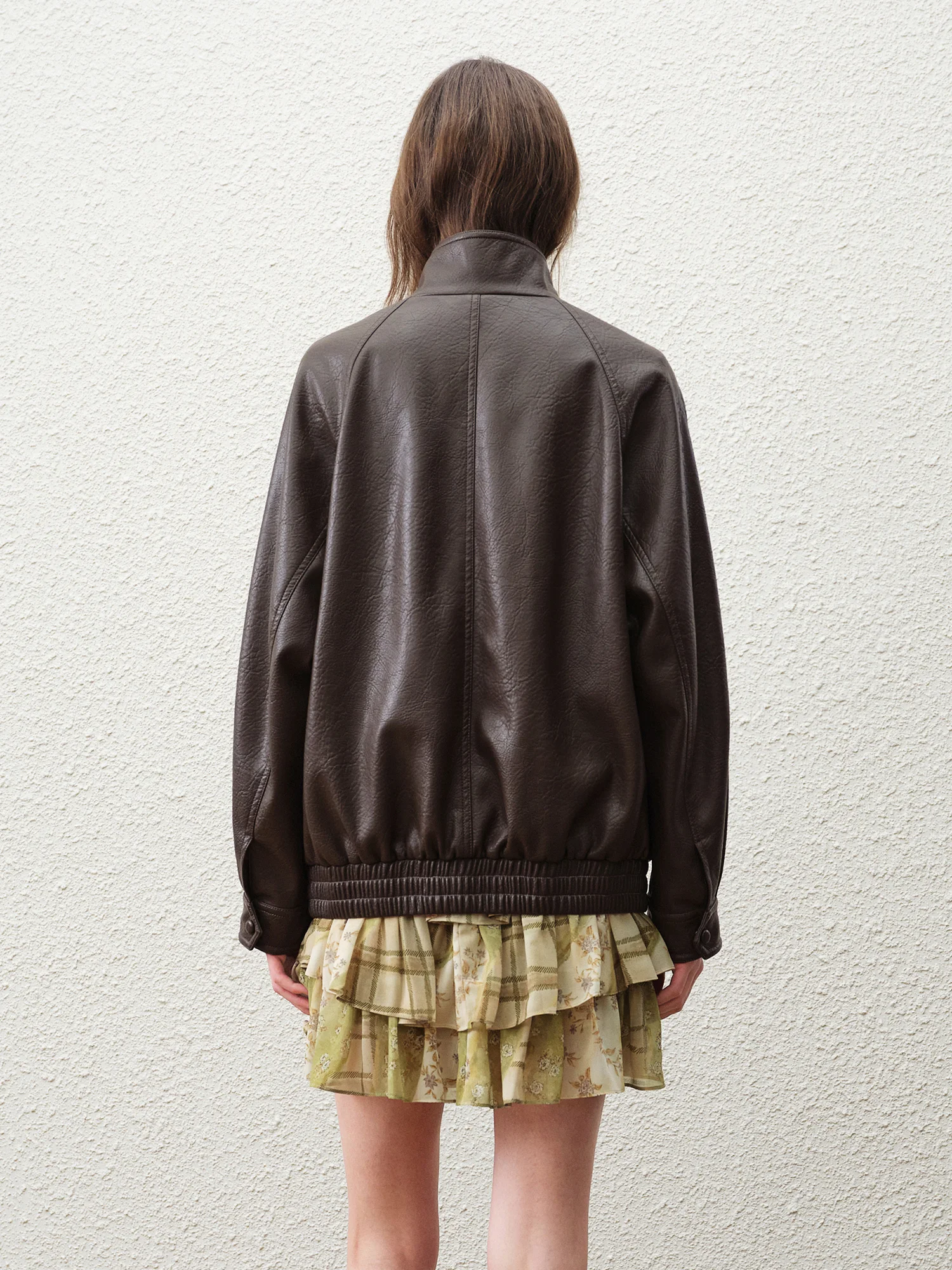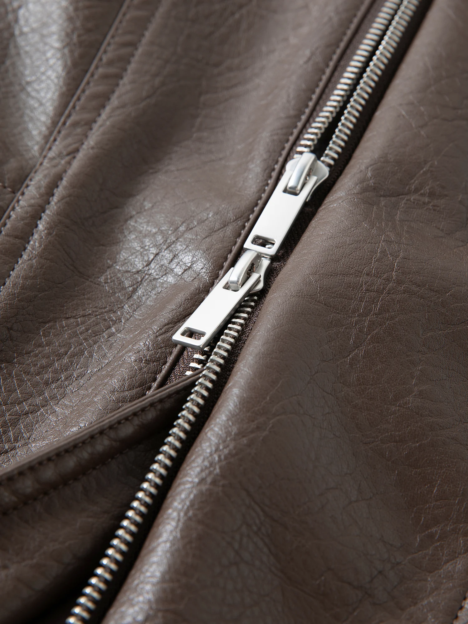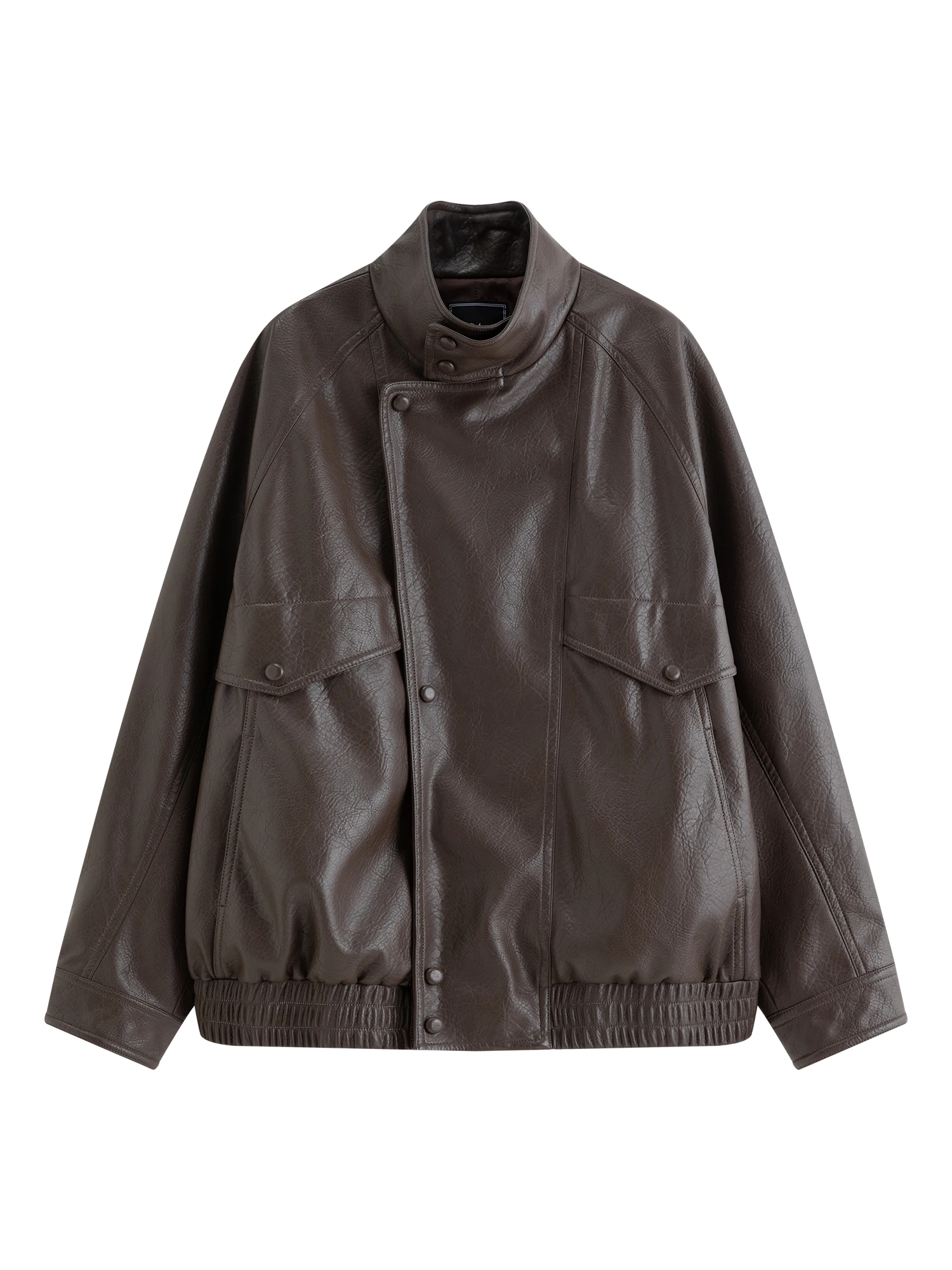 Brown Faux Leather Jacket with Zipper and Button-Up Collar