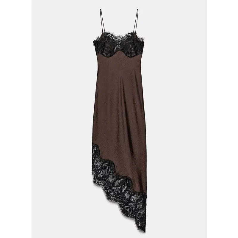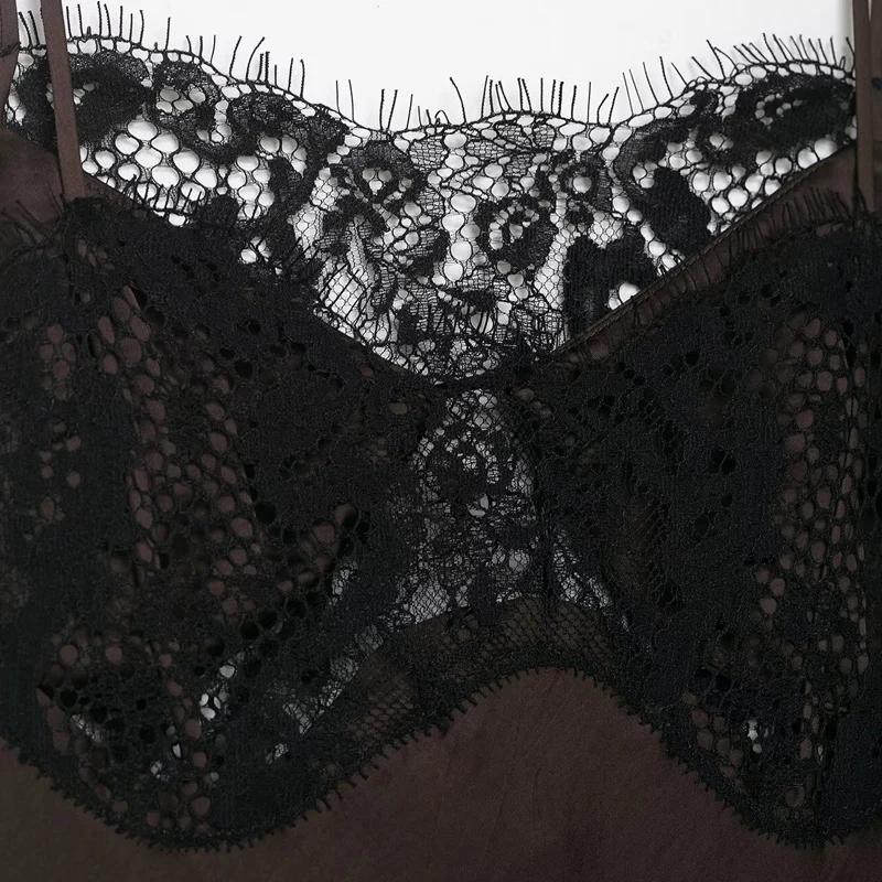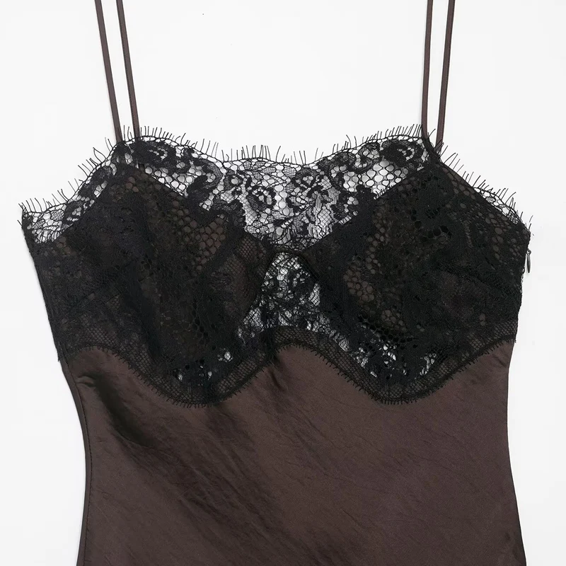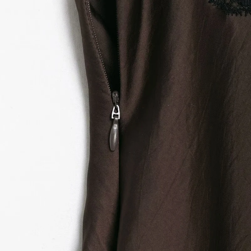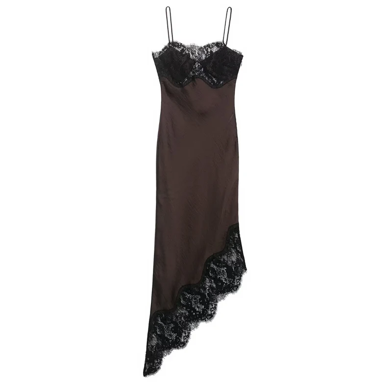 This brown satin camisole dress with black lace trim offers a mid-calf length cut with an asymmetrical silhouette, designed for women seeking an understated yet refined look. Its empire waistline and sleeveless design provide a comfortable, regular fit that suits spring and summer occasions.