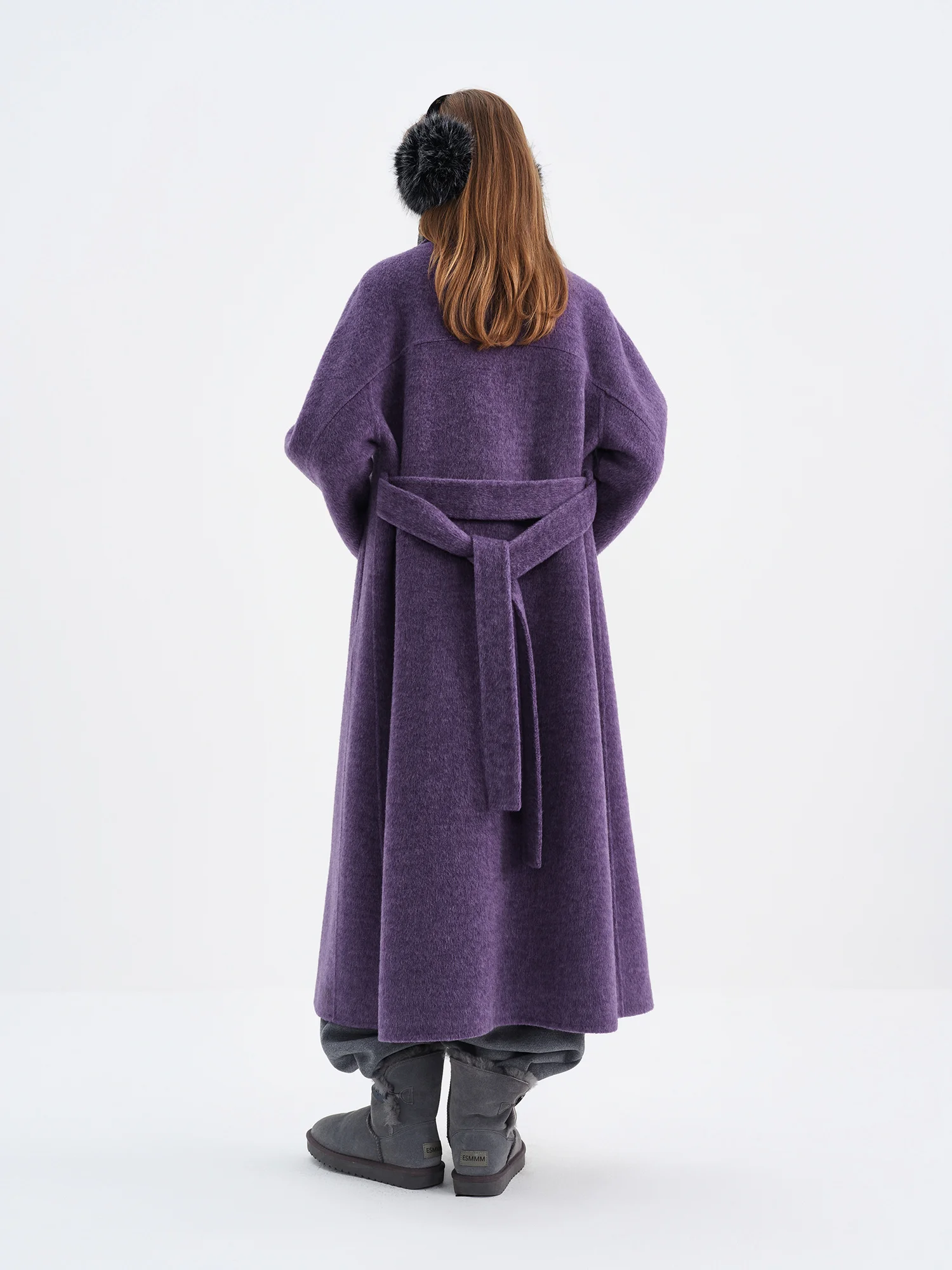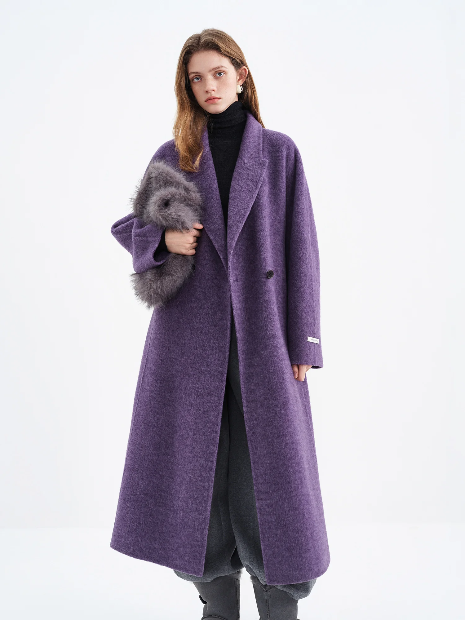Constructed primarily from 100% sheep wool (purple/white variant) and a blend of 96.8% sheep wool with 3.2% camel wool (grey variant), the fabric offers natural insulation and breathability. To maintain the coat’s quality and appearance, gentle dry cleaning is recommended. Avoid washing and bleaching to preserve the fabric’s integrity.