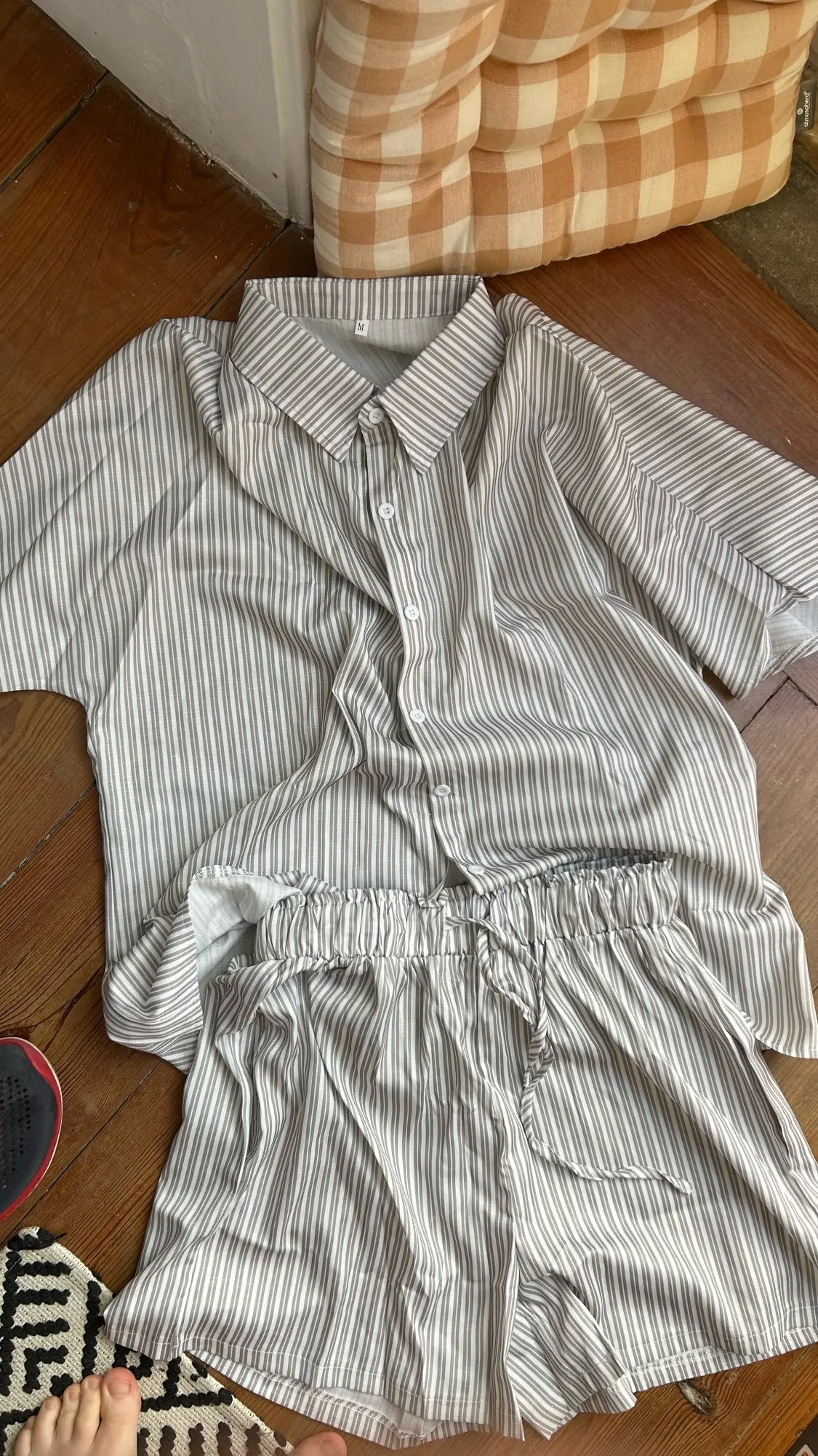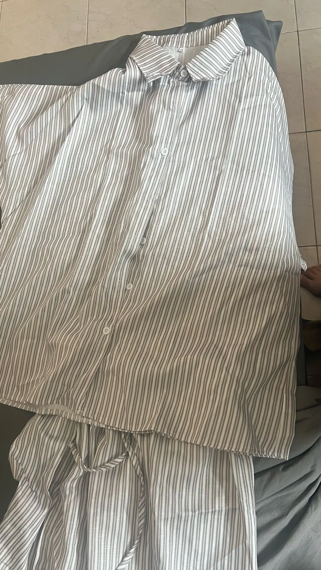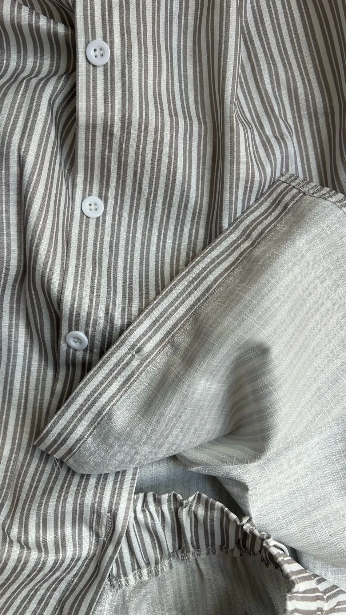 Step into effortless sophistication with this chic striped set. Crafted from a luxurious blended fabric, the single-breasted shirt and wide-leg shorts offer a relaxed fit, perfect for sunny days. Featuring a turn-down collar and drawstring closure, this ensemble combines comfort and elegance, making it an essential addition to your spring/summer wardrobe.