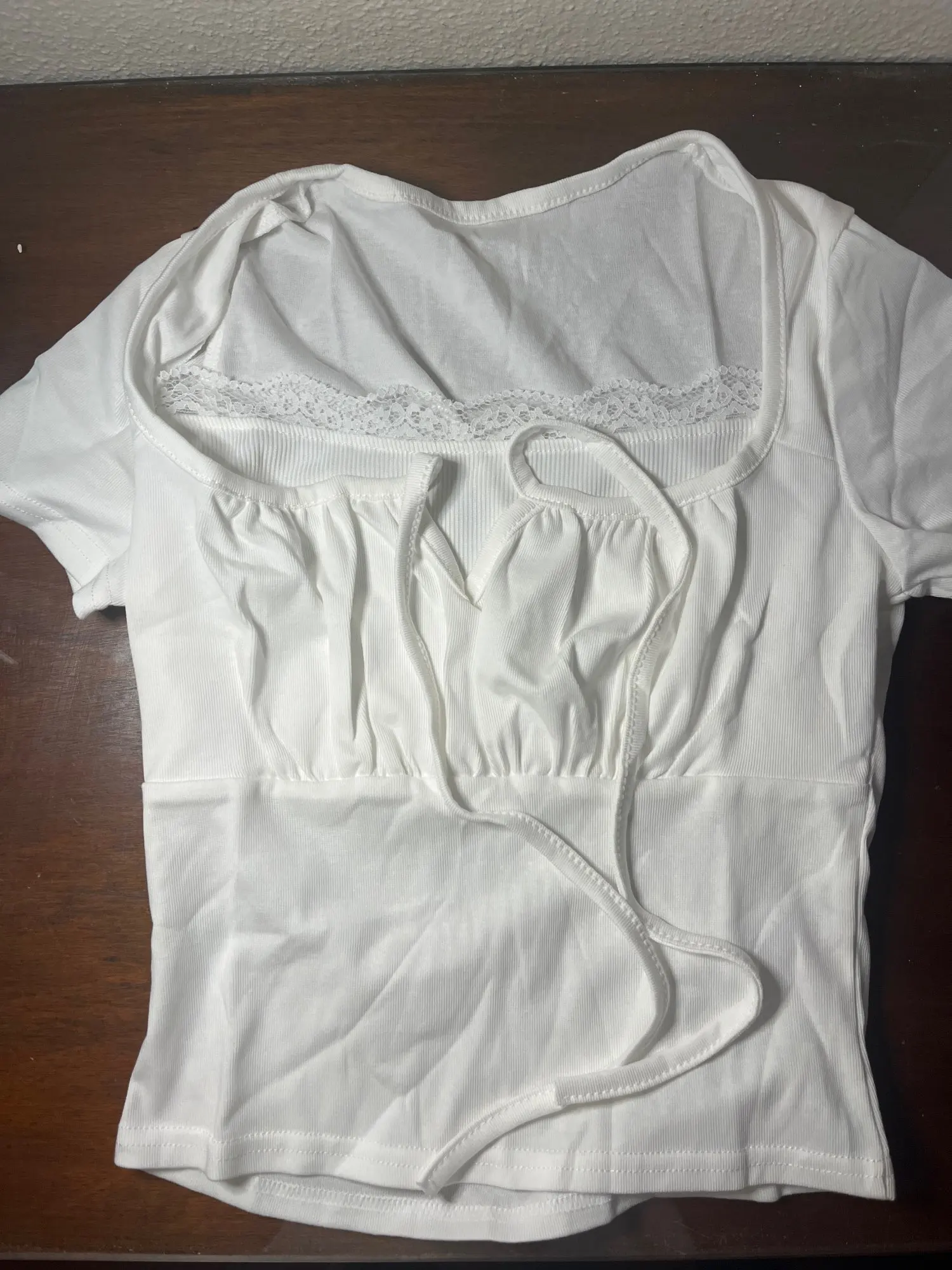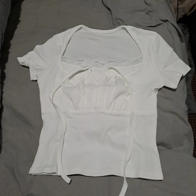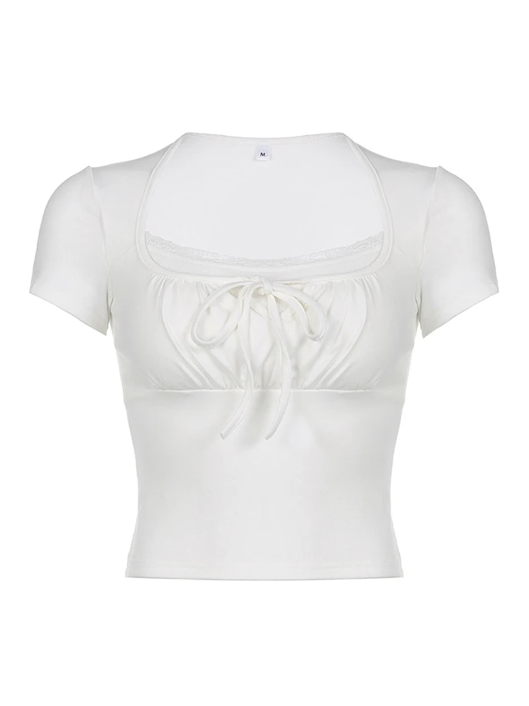Embrace summer elegance with this Trendy White Knitted Tee, a luxurious addition to your wardrobe. Crafted from soft, high-stretch polyester and spandex, it features a charming lace decoration and a flattering square collar. The regular fit ensures comfort, while its short length and classic solid pattern make it a versatile staple for every occasion. Perfect for a casual day out or a chic evening, this tee is designed for every body.