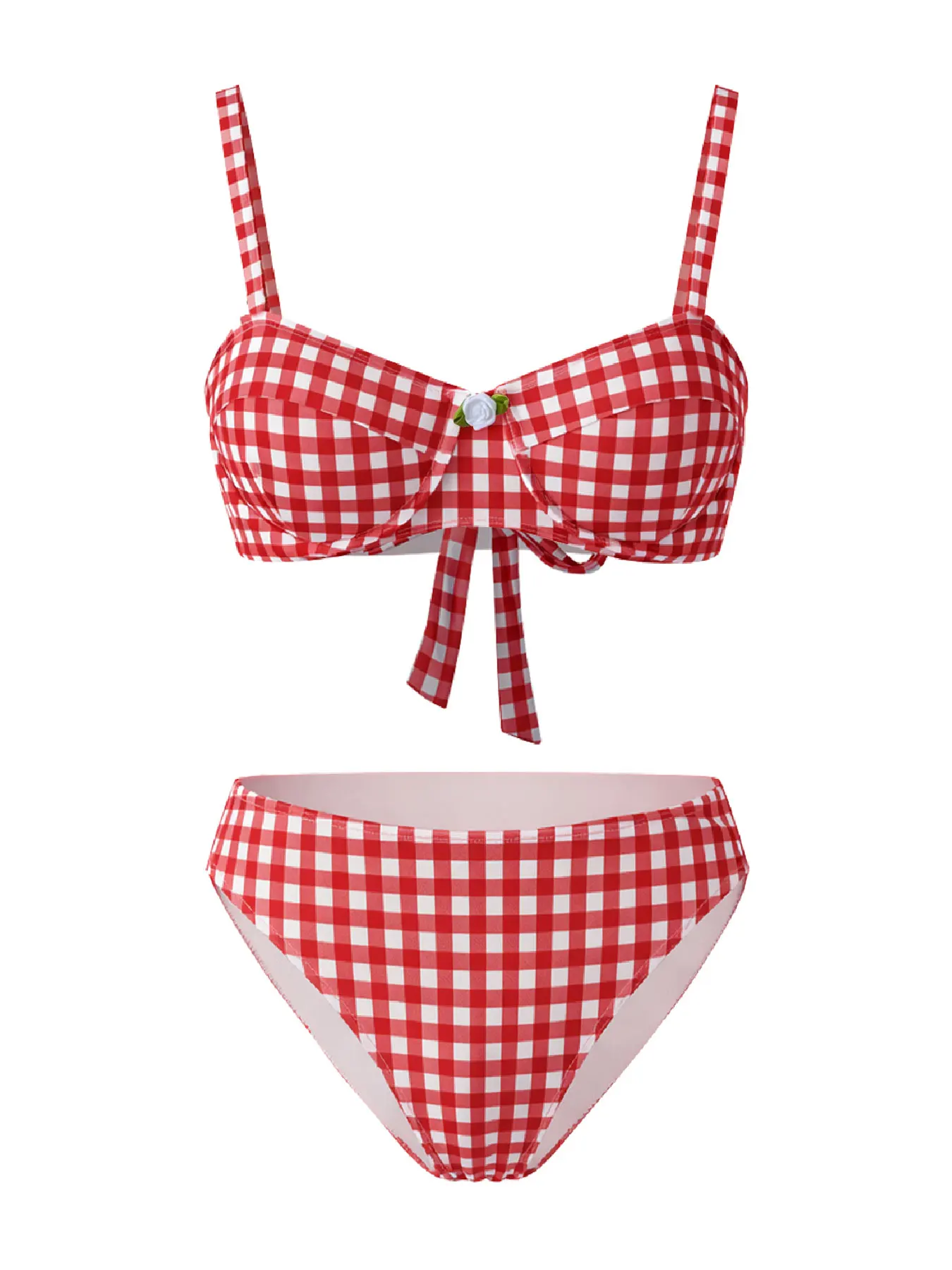 Designed for women who appreciate a blend of classic style and practical comfort, this bikini set features a red and white plaid pattern with a subtle knotted detail. The set includes a wire-free top with padded cups to gently shape and support, complemented by mid-waist bottoms that provide balanced coverage suitable for various body types.