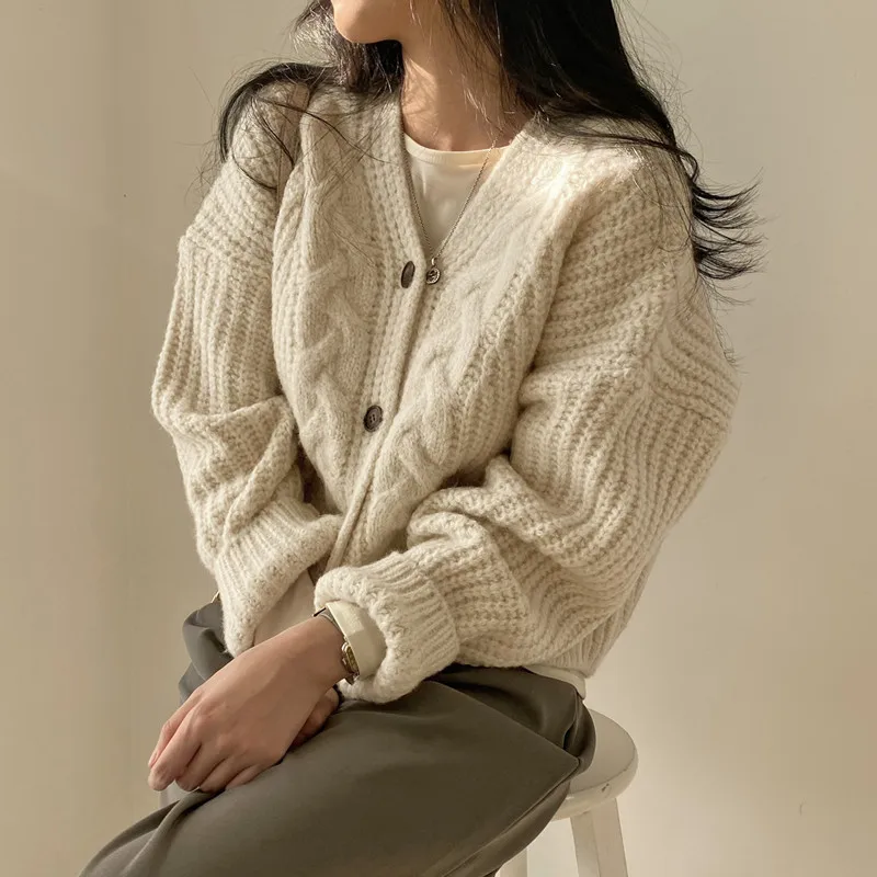 Cozy Knit Cardigan with Lantern Sleeves and V-Neck