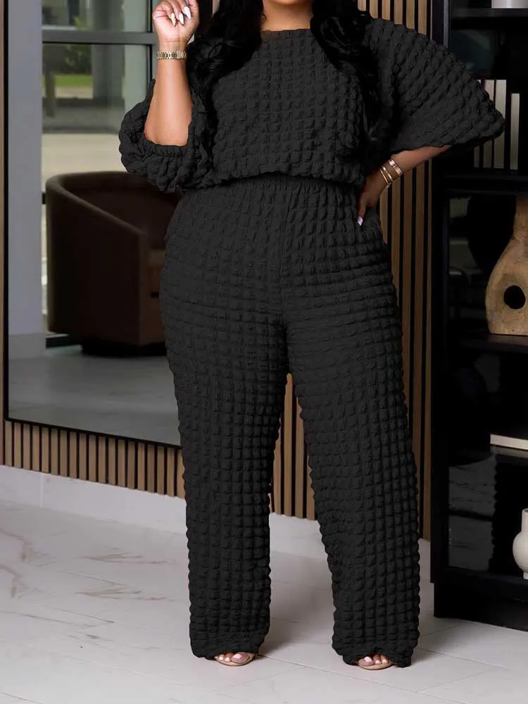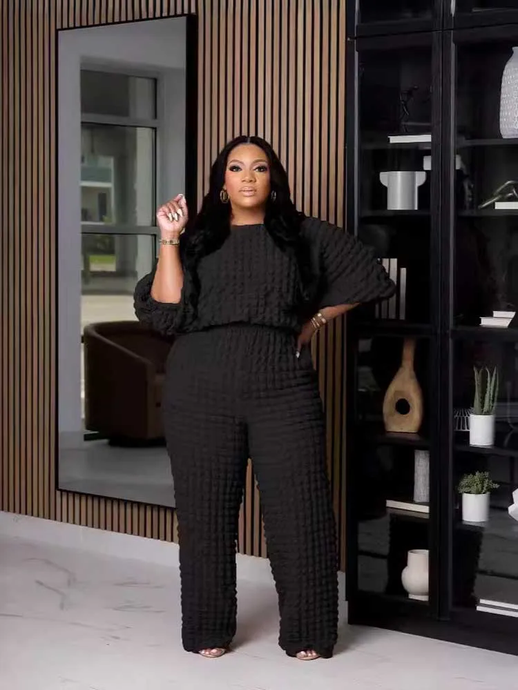 Step into the season with grace and style in our Luxurious 2-Piece Outfit Set, thoughtfully crafted for every body. This exquisite ensemble features a bubble waffle pleated top paired with matching pants, designed to celebrate natural beauty while keeping you comfortable and confident. Perfect for autumn and winter occasions, this outfit is your go-to choice for effortless elegance.