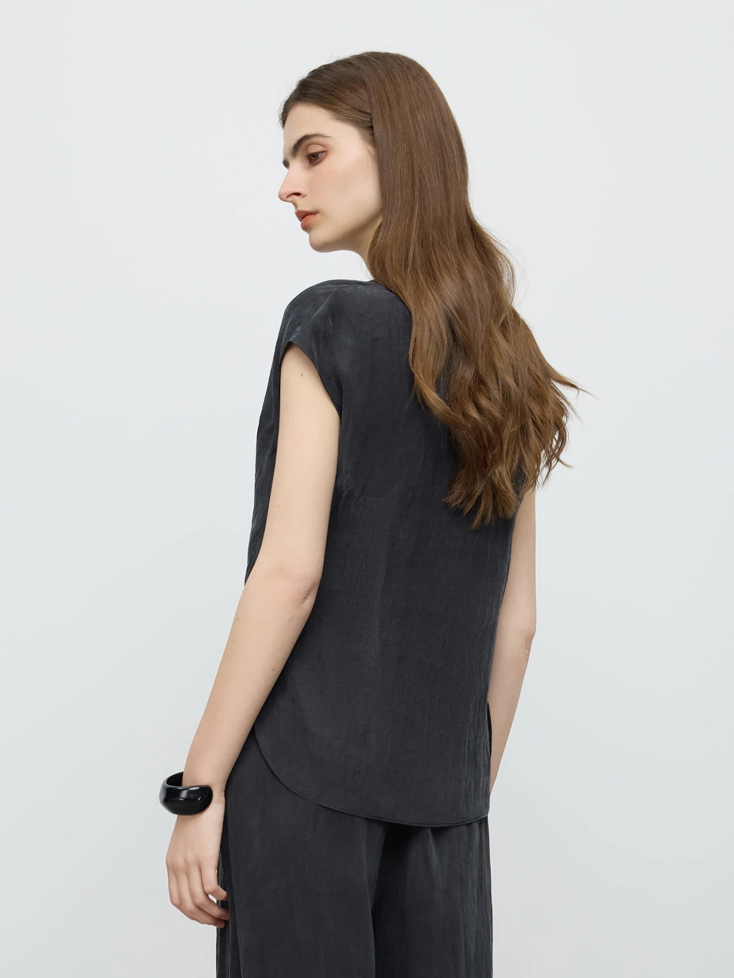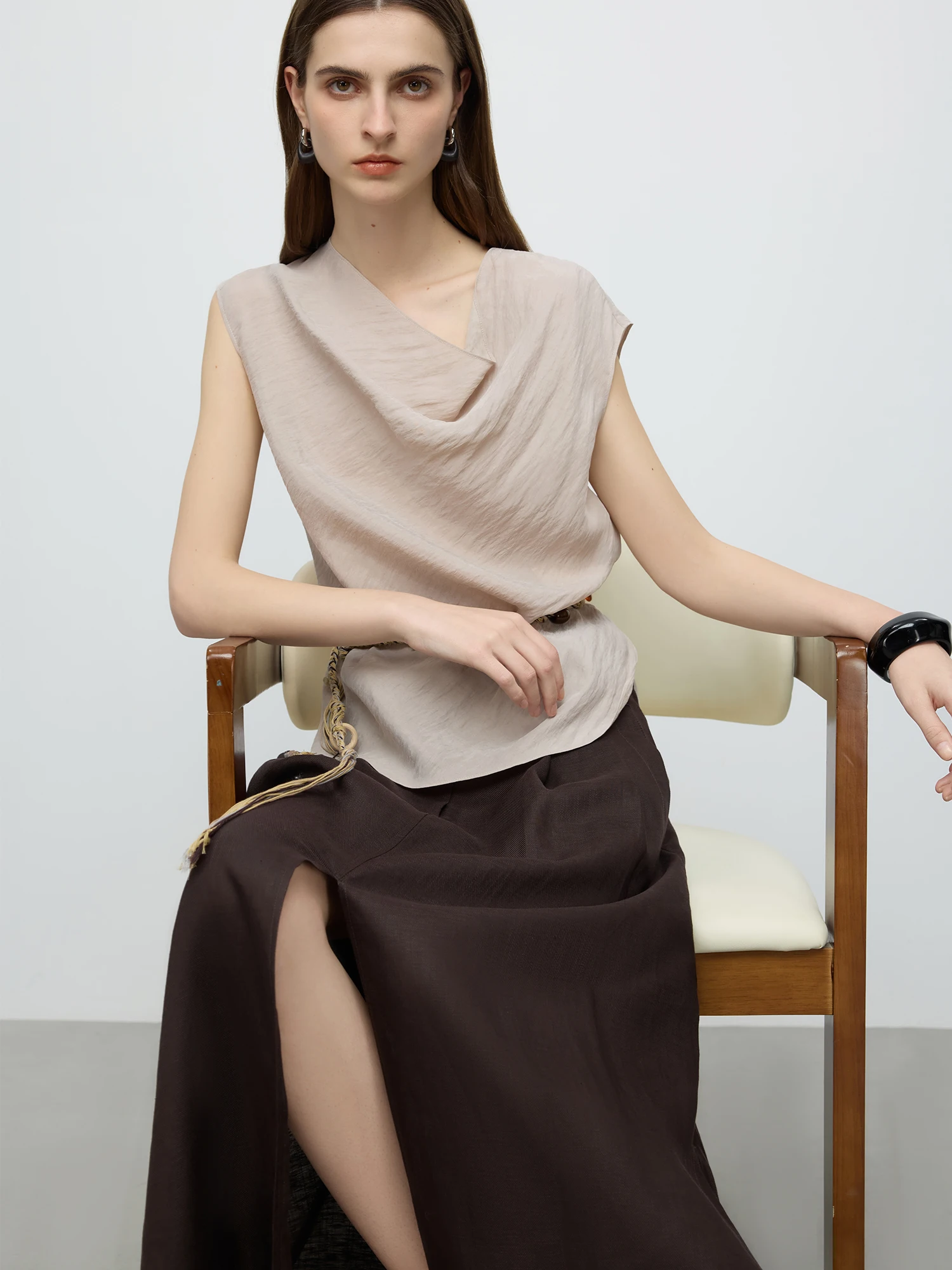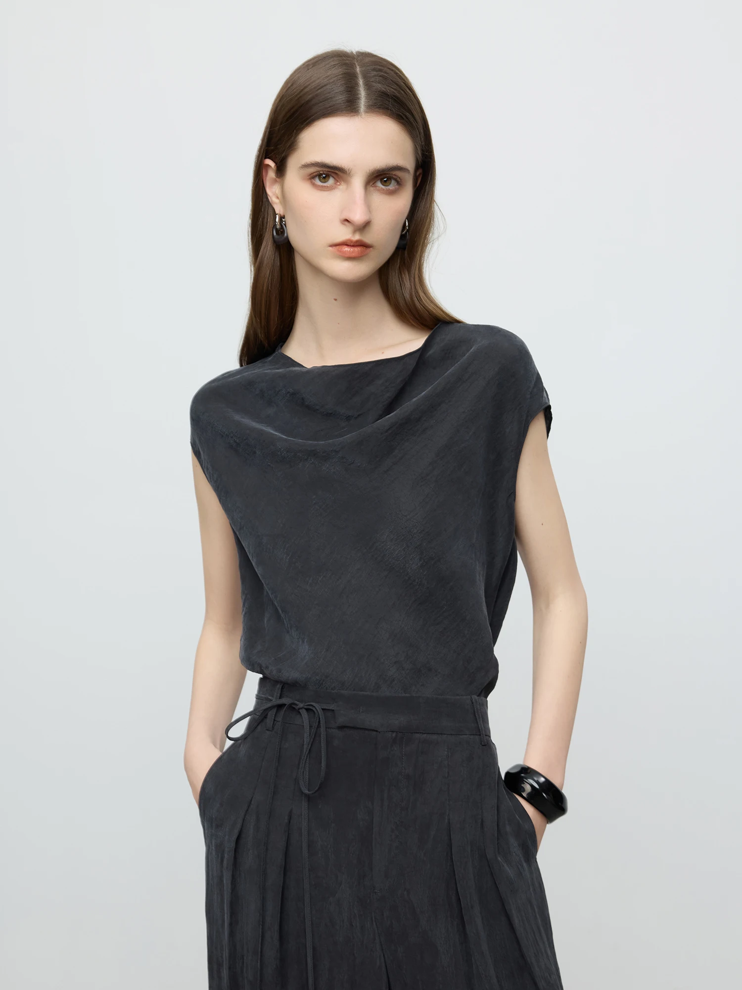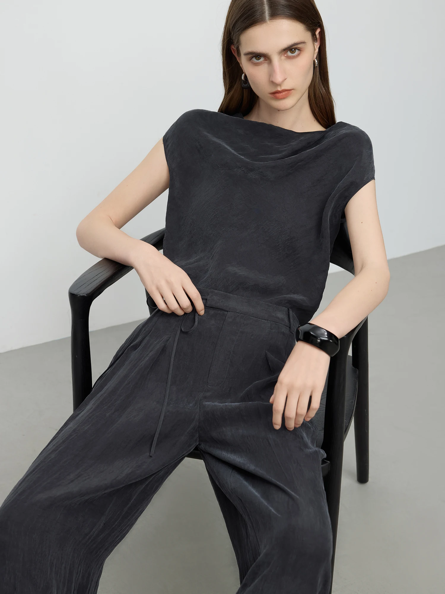 Draped Collar Sleeveless Shirt and Wide Leg Pants Set