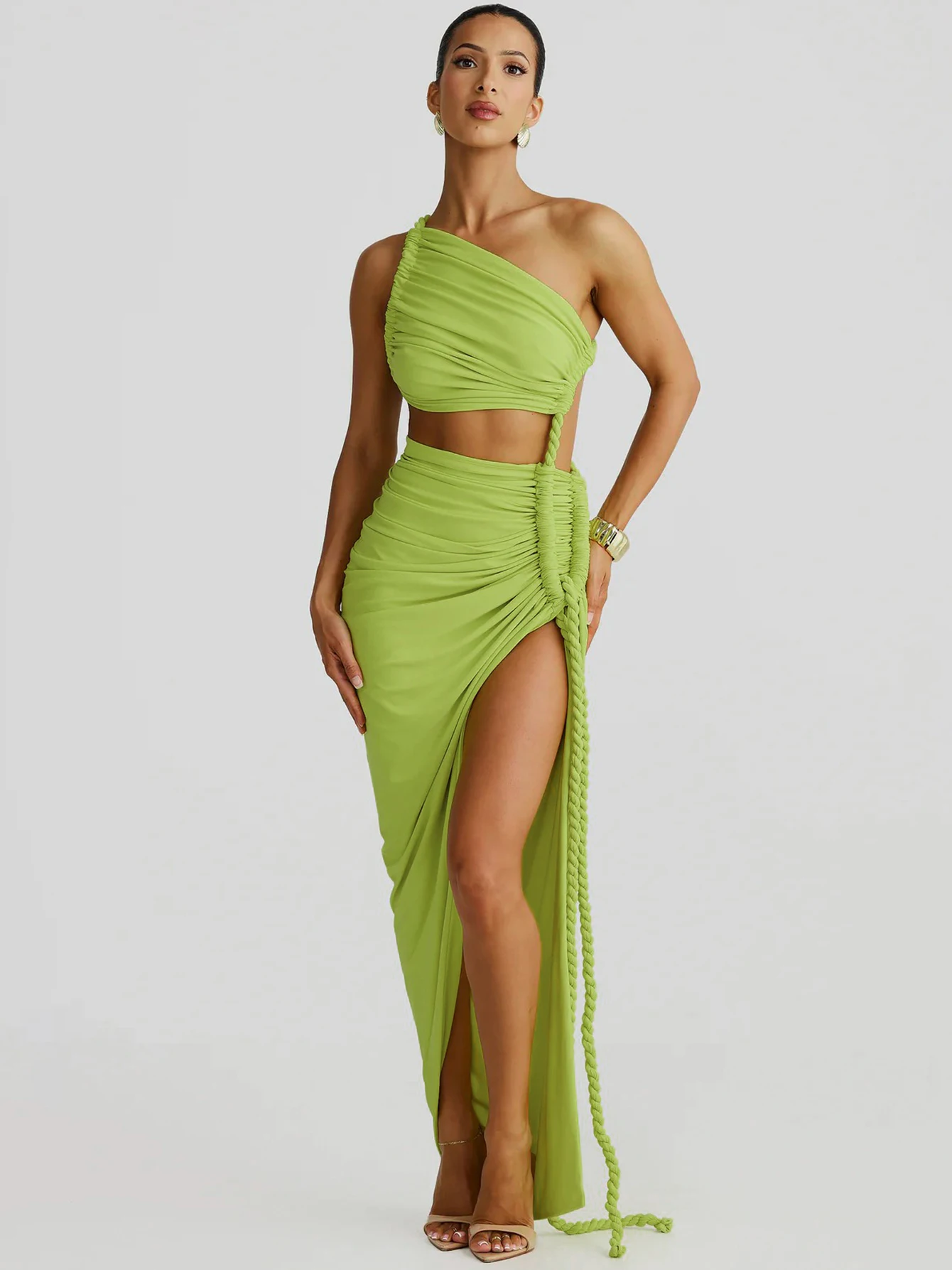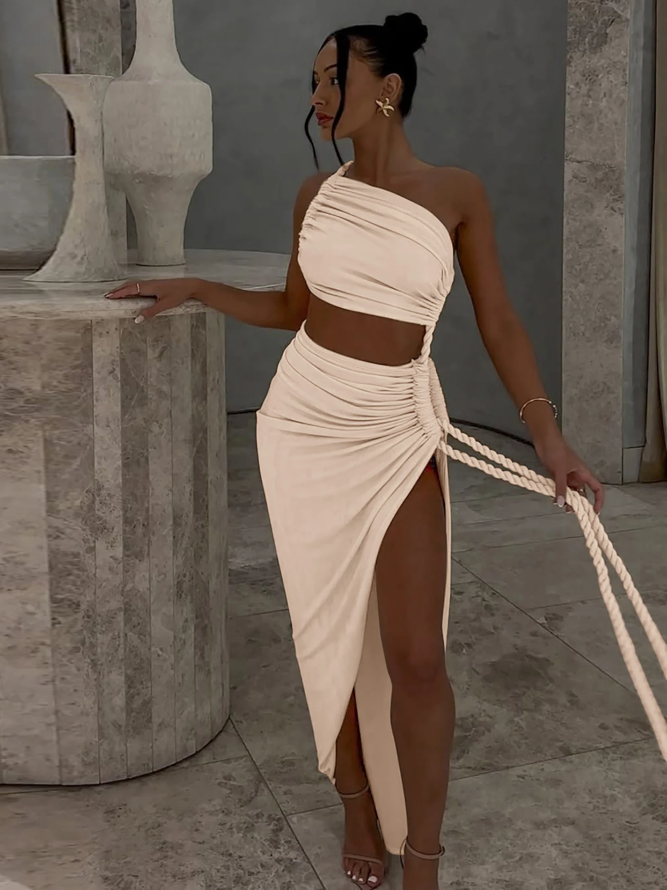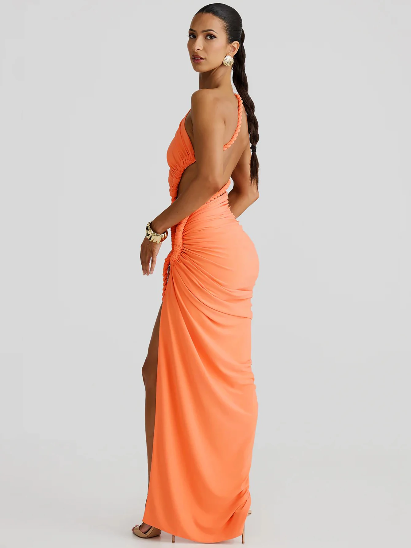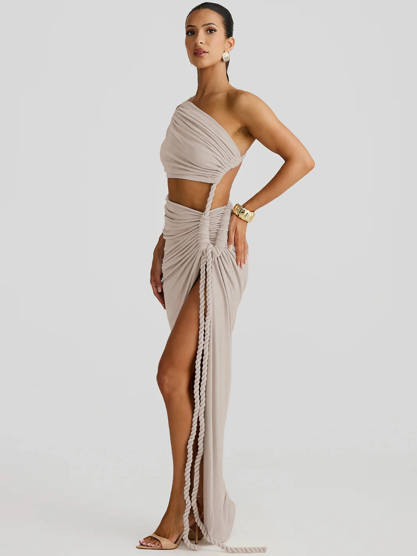 Step into sophistication with this Sleek One Shoulder Backless Maxi Dress. Available in stunning hues like apricot, gray, green, and orange, its asymmetrical design and high split create an alluring silhouette. Crafted from a luxurious polyester blend, this ankle-length dress offers a smooth, confident fit, perfect for summer soirées. Ideal for those seeking elegance with a touch of boldness, this piece is your go-to for making a statement. Designed for every body, embrace your natural beauty in style.