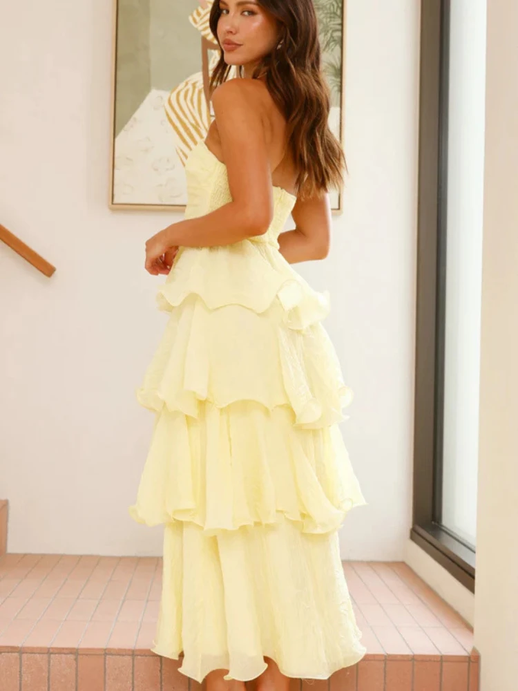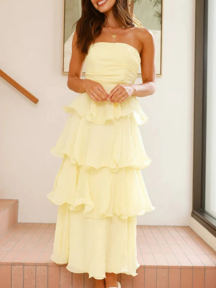 Experience refined summer elegance with the Elegant Fluffy Cake Maxi Dress, a versatile piece designed for women seeking a graceful silhouette combined with comfort. This ankle-length dress features a flattering A-line cut and an open back detail, perfect for warm-weather social occasions. Crafted from medium-stretch polyester, it offers ease of movement while maintaining a sleek profile. Available in a palette of blue, yellow, green, pink, and purple, it complements a range of personal styles.