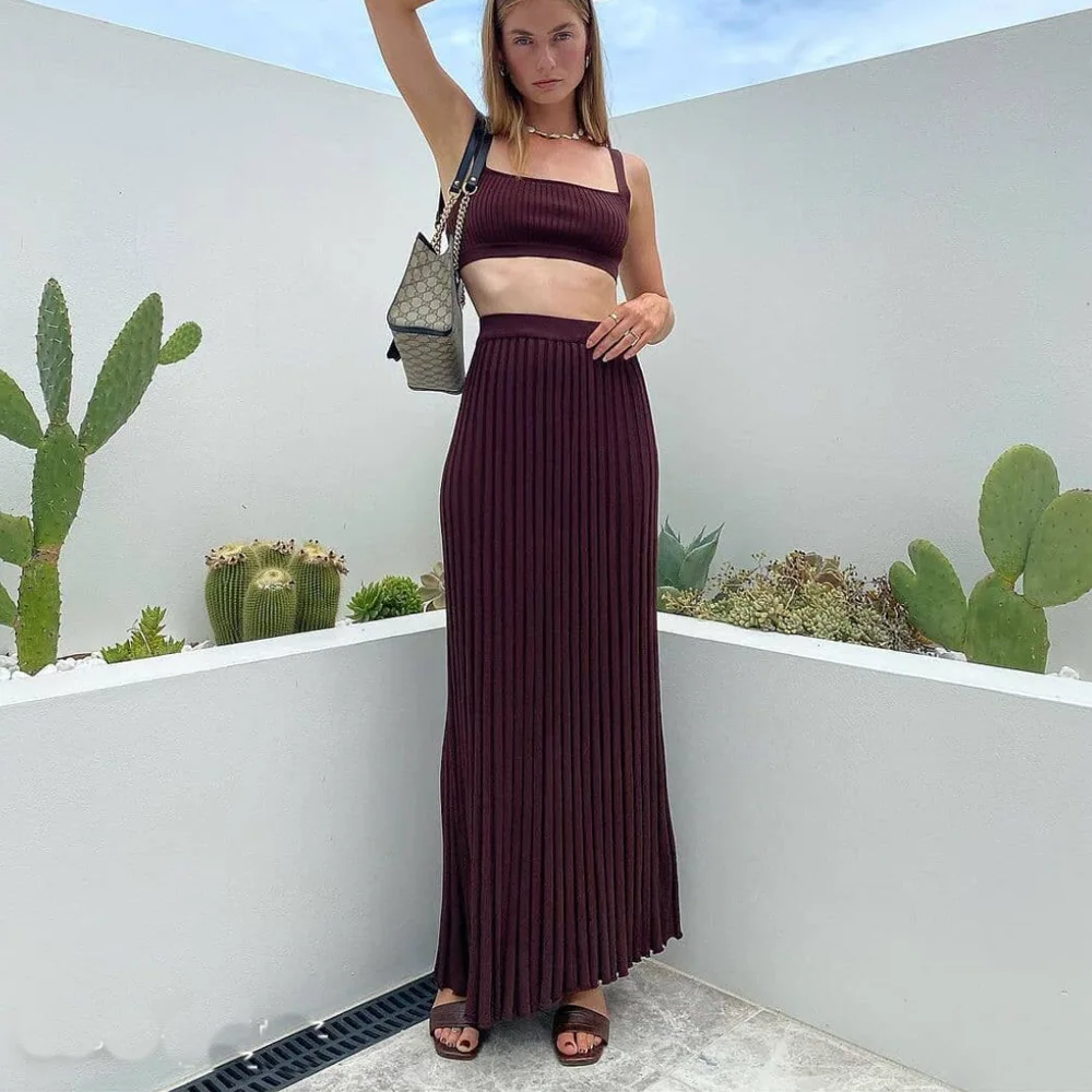 Chic Summer Knitted Skirt Set: Crop Top & Maxi Elegance