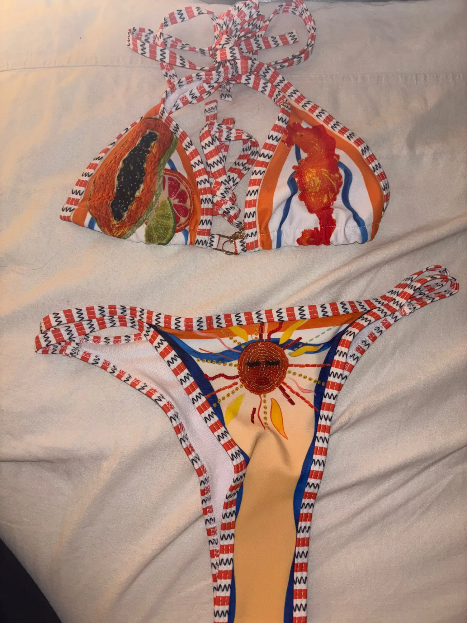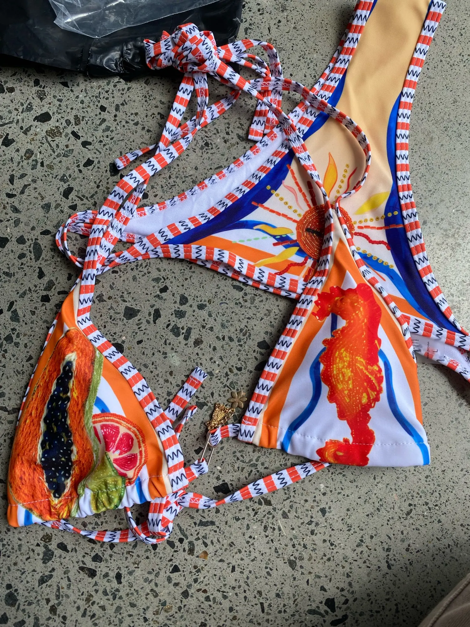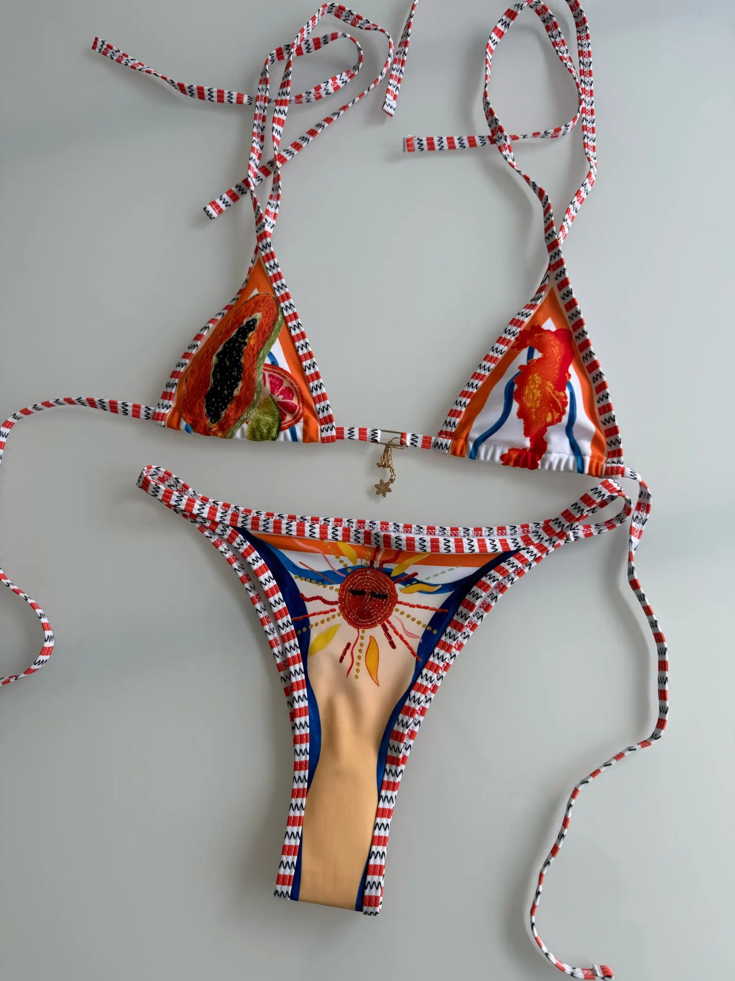 Made from durable polyester with a slight stretch, this bikini set maintains its shape while allowing freedom of movement. For longevity, hand wash in cold water and lay flat to dry, preserving the fabric’s texture and colour vibrancy.