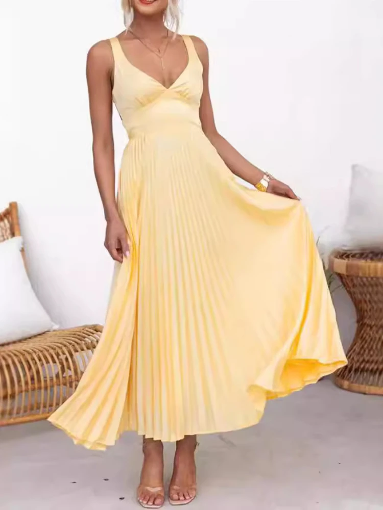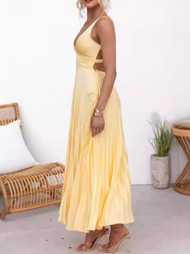 Elegant Yellow A-Line Vacation Dress with V-Neck and Spaghetti Straps