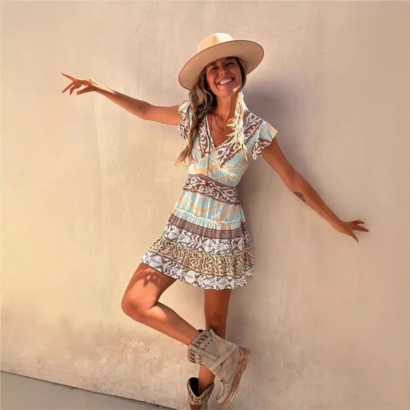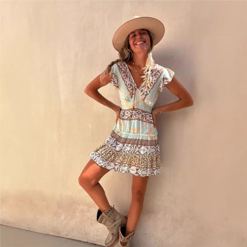 Printed A-Line Summer Dress with V-Neck and Flutter Sleeves