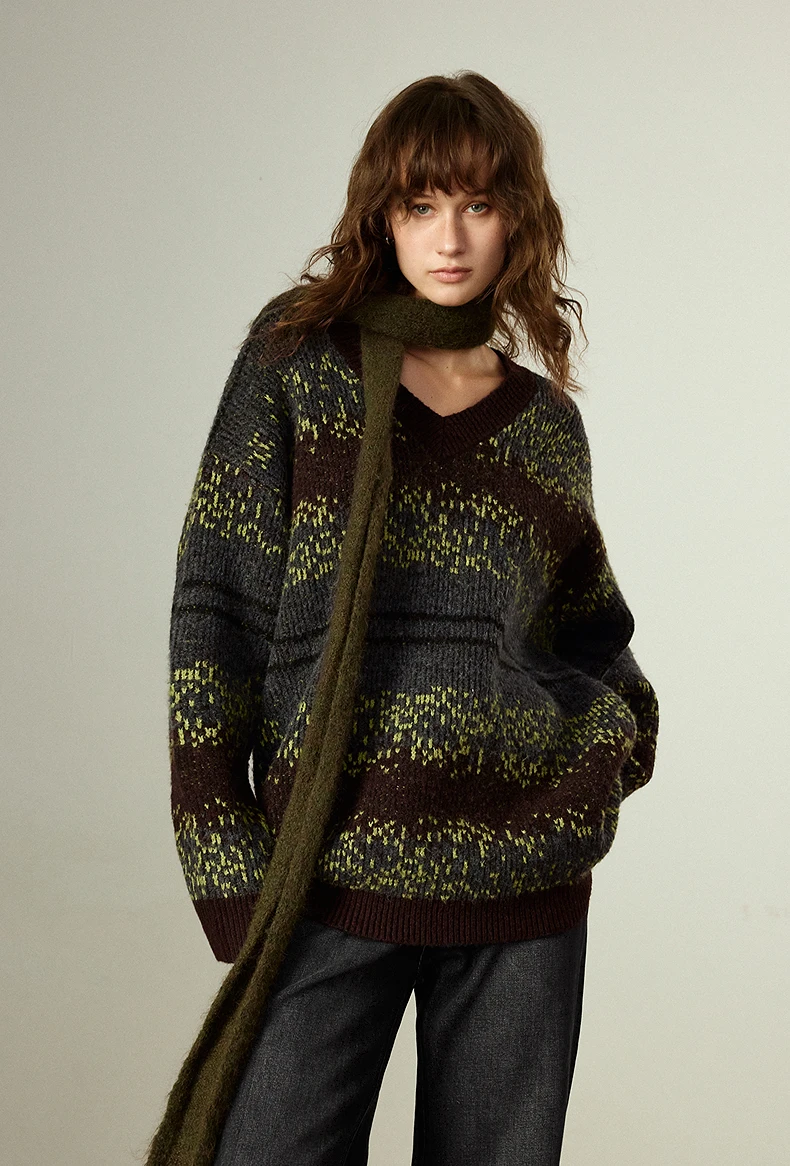 Fair Isle Pattern Striped V-Neck Sweater in Mid-Length Loose Fit