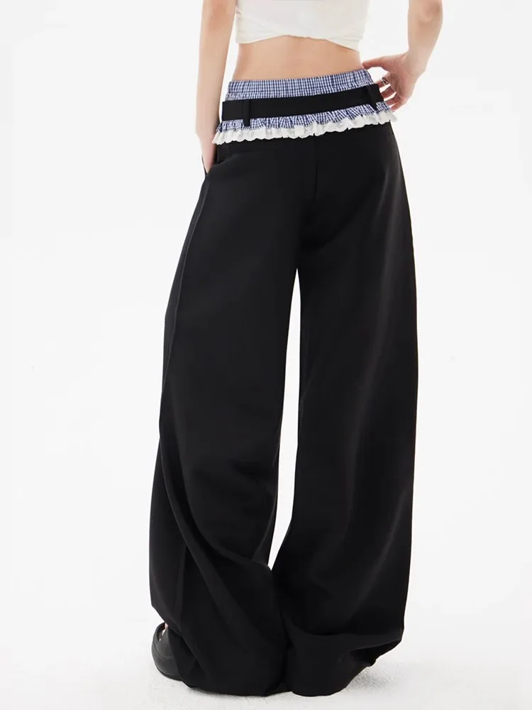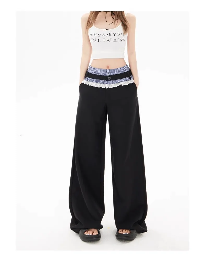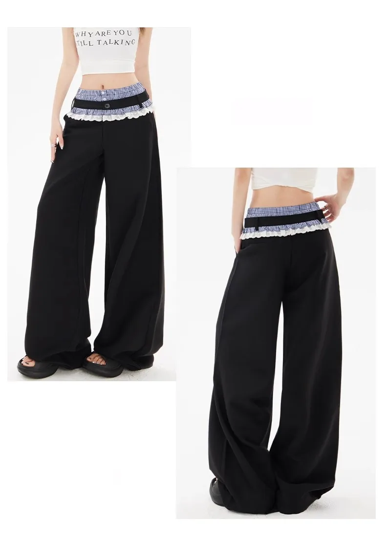 These wide leg casual pants combine understated design with functional comfort, tailored for everyday wear. The high waist and loose fit create a relaxed yet refined silhouette, while the full-length cut maintains a contemporary profile. A subtle lace patchwork detail introduces a delicate texture, offering a modest embellishment that complements the minimalist aesthetic.