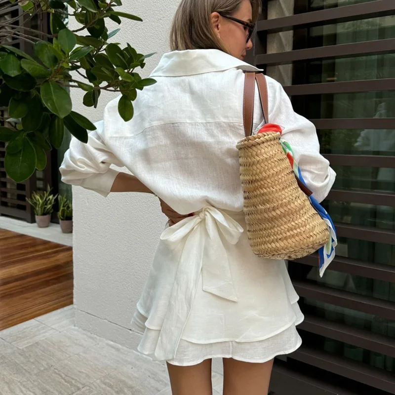 Step into sophistication with this exquisite two-piece set. The elegant lapel long sleeve shirt pairs flawlessly with a lace-up A-line skirt, creating a refined silhouette. Crafted from premium synthetic fibers, this outfit is perfect for all seasons. Embrace effortless style and make a statement in the office or beyond.