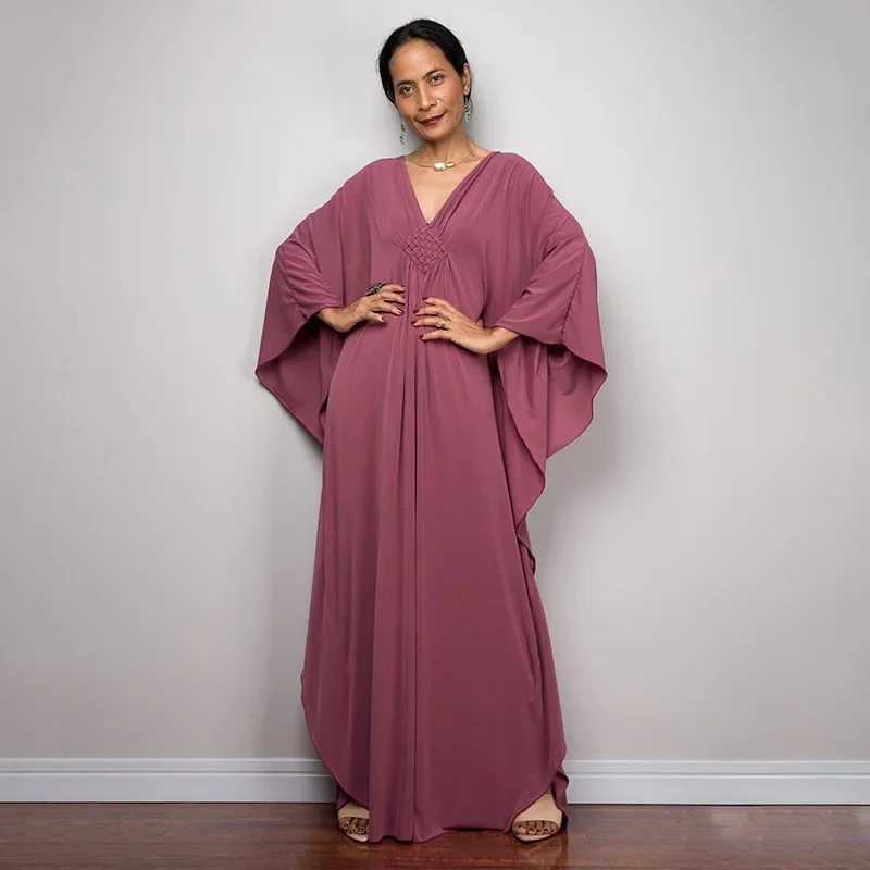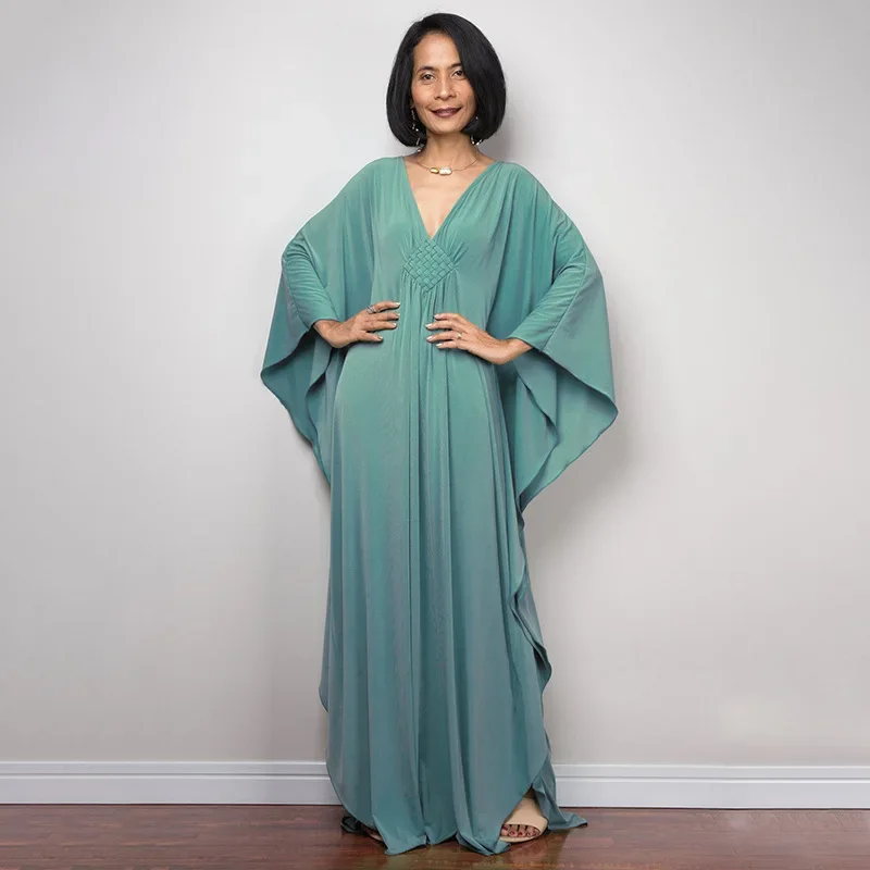 Q: Does the kaftan provide adequate coverage?A: The ankle-length design offers graceful coverage while the V-neckline and batwing sleeves enhance comfort and movement.