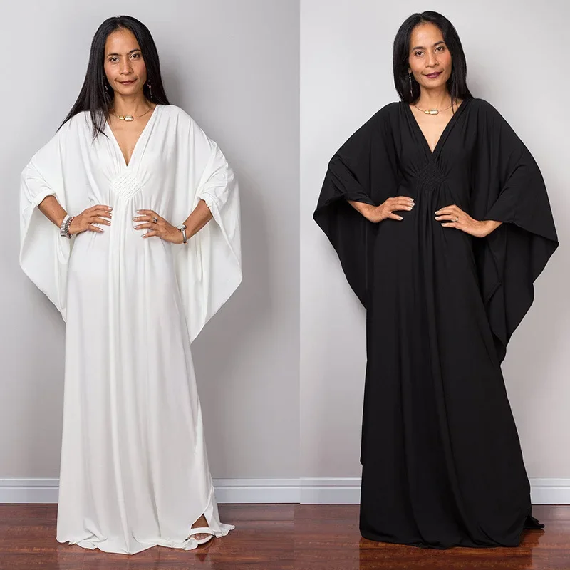 Elevate your resort wardrobe with the Flowy V-Neck Batwing Sleeve Kaftan Coverup, a refined piece designed for graceful comfort. This ankle-length kaftan features a slim silhouette that drapes elegantly, crafted from lightweight polyester with a slight stretch to ensure ease of movement. Its V-neckline and batwing sleeves provide breathable comfort, making it an ideal choice for spring and summer wear.