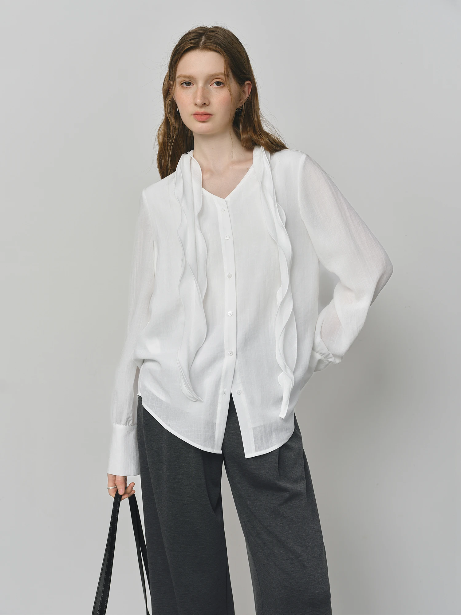 Autumn Elegant Blouse with Asymmetric Flounce – V-Neck, Long Sleeve
