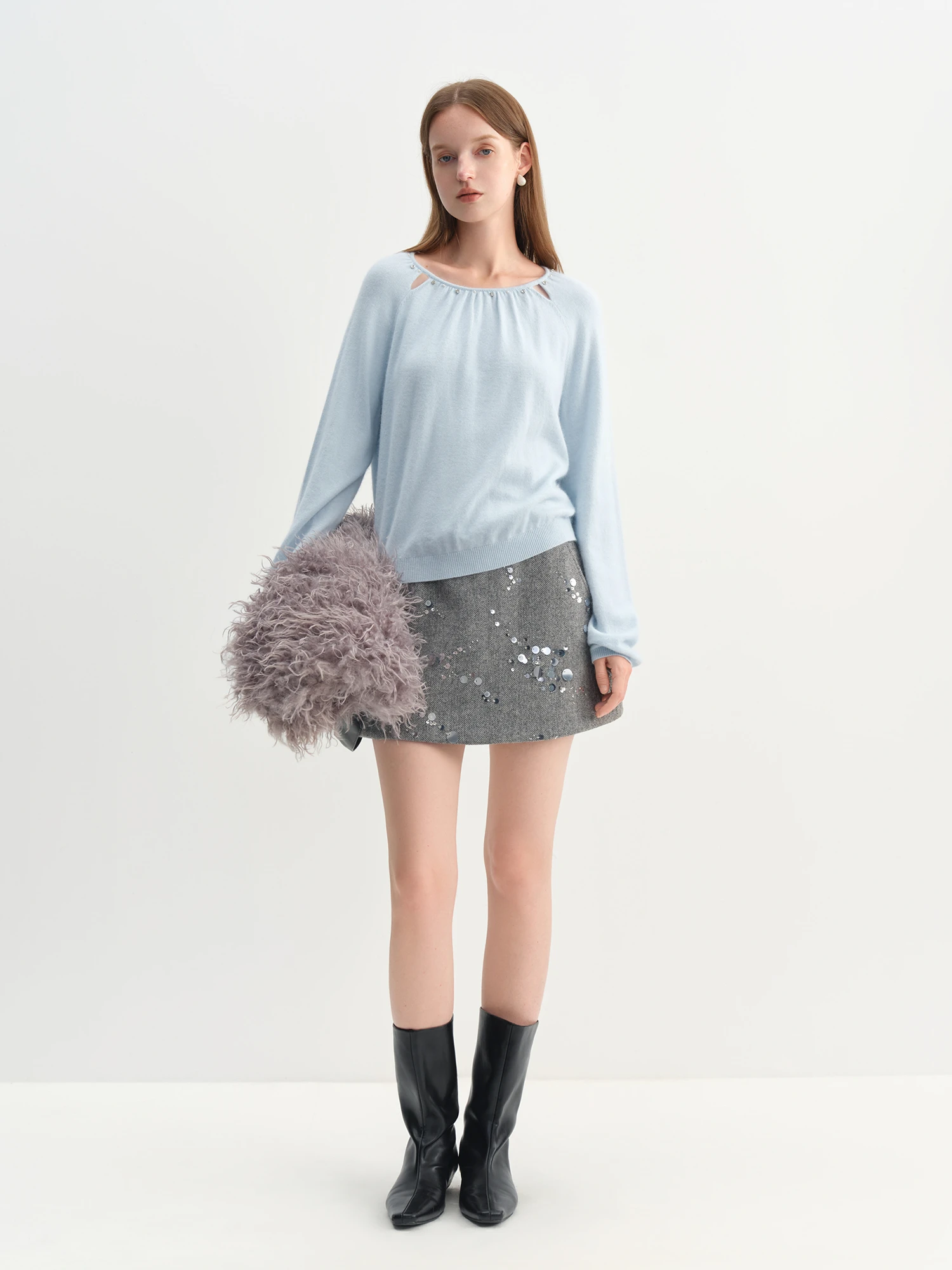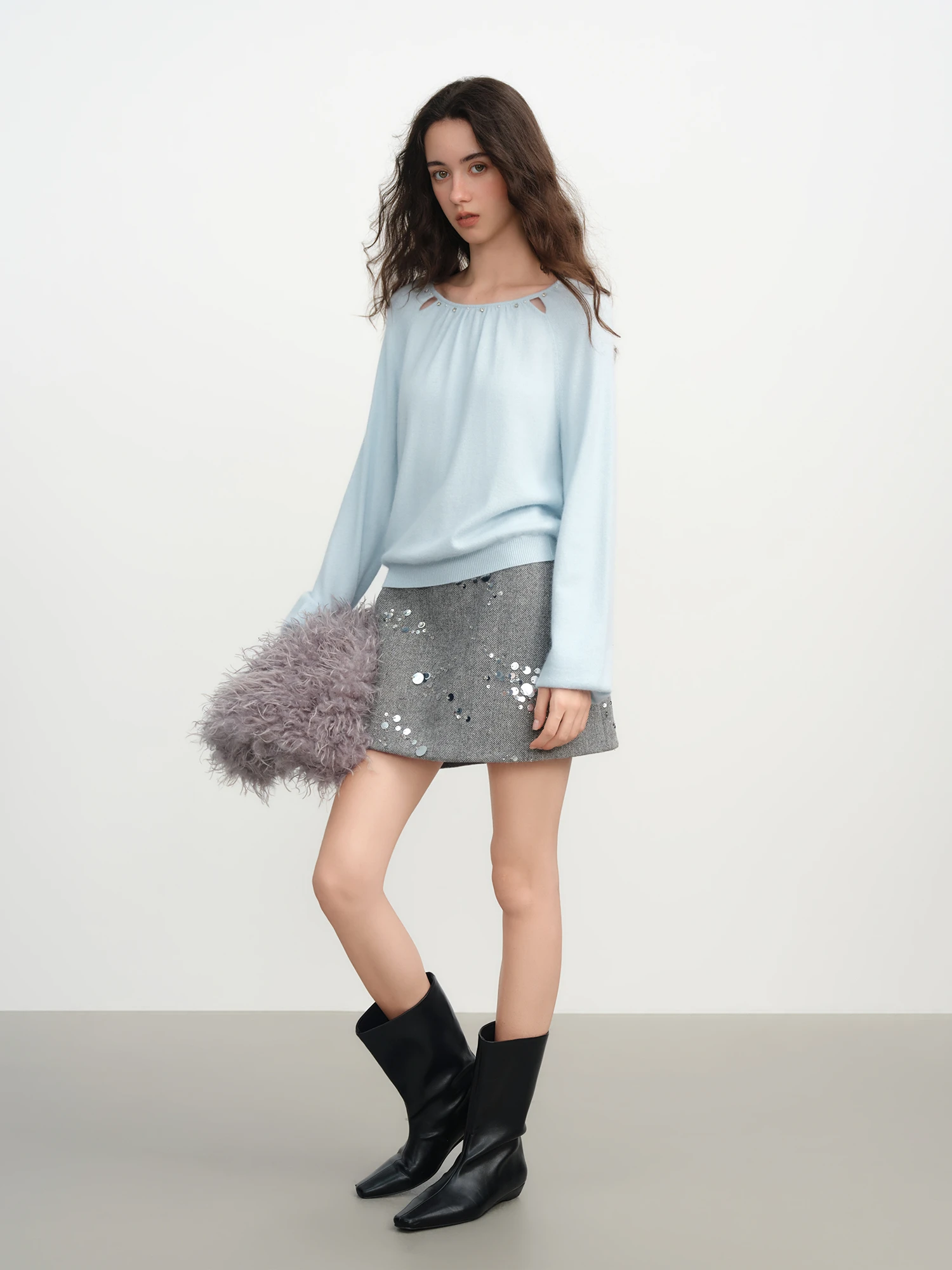 - Crafted from a blend of polyamide, viscose, rabbit hair, and sheep wool, offering a soft touch against the skin.