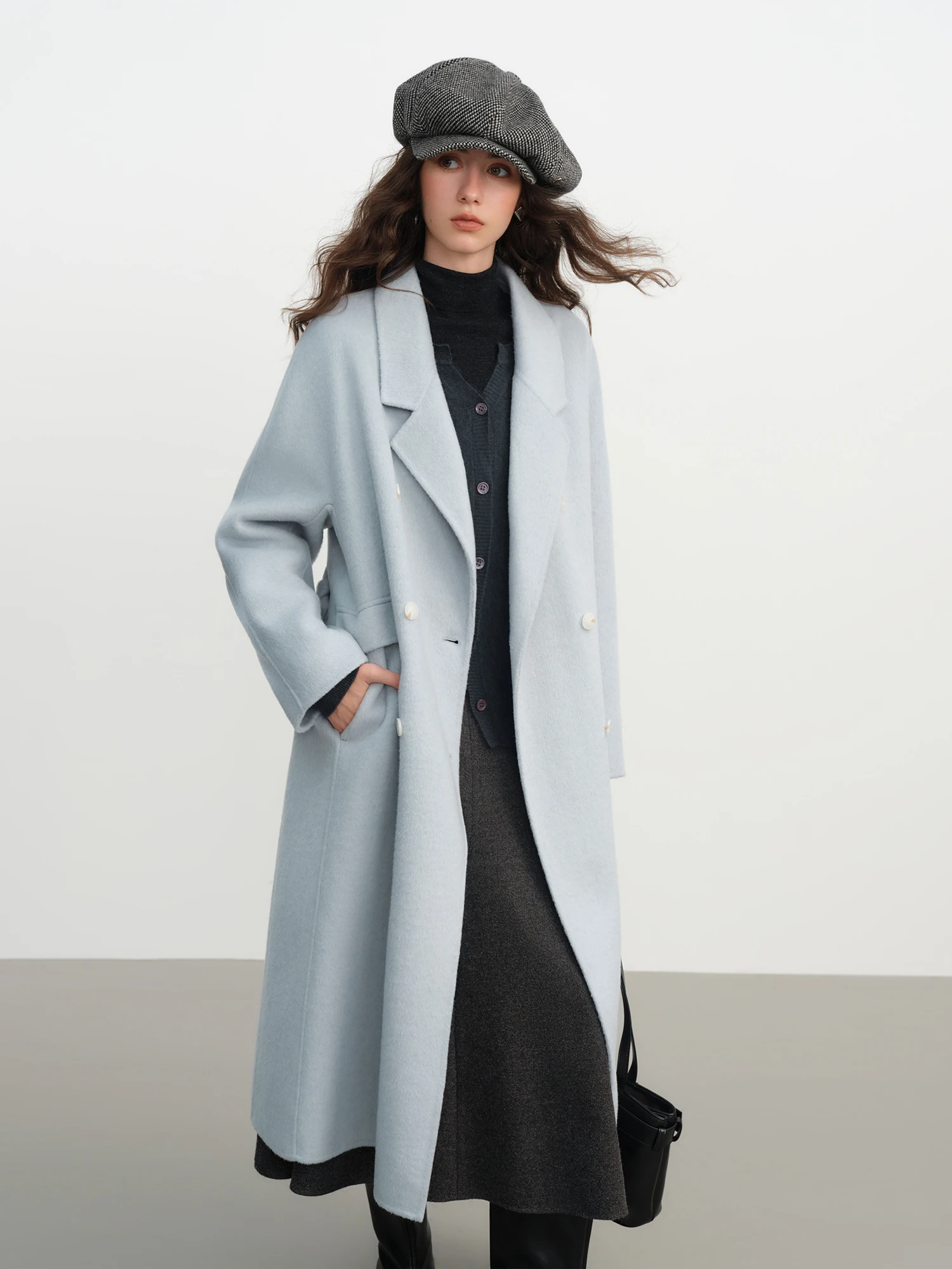 Introducing the Cashmere Double-breasted Woolen Coat in Light Blue, a refined choice for the modern woman seeking warmth and elegance. This long coat is designed to enhance your autumn and winter wardrobe with its sophisticated silhouette and refreshing hue.