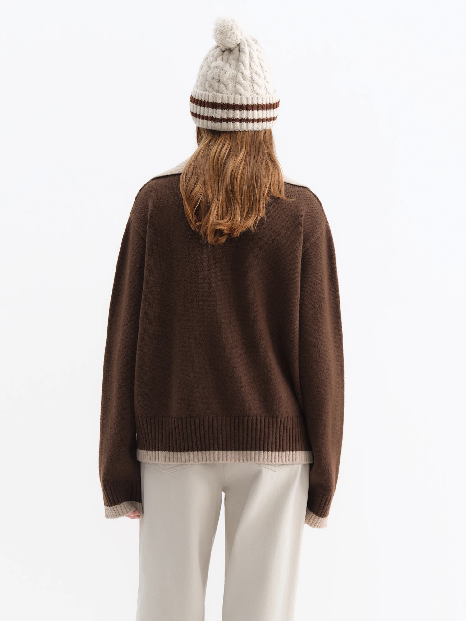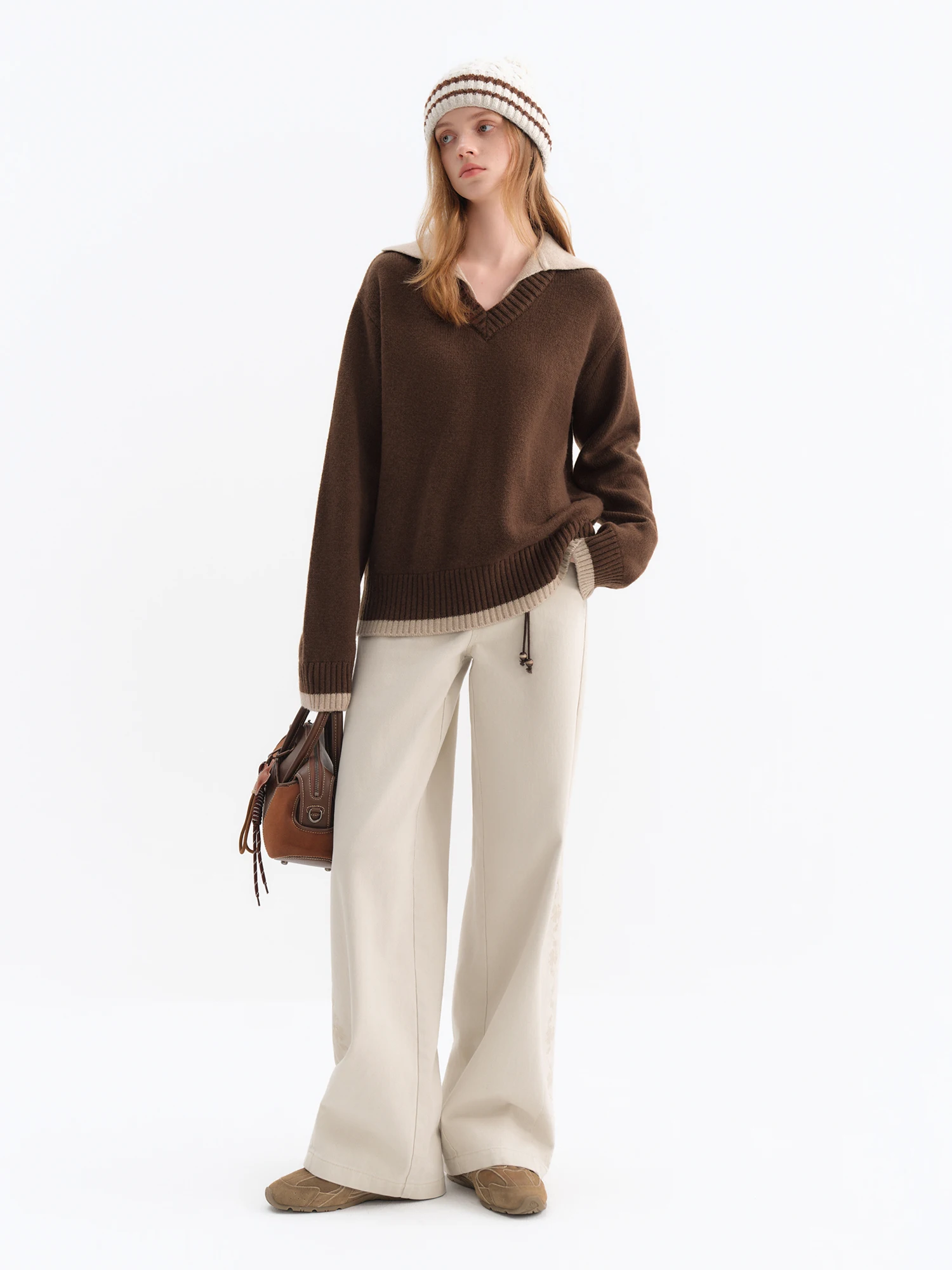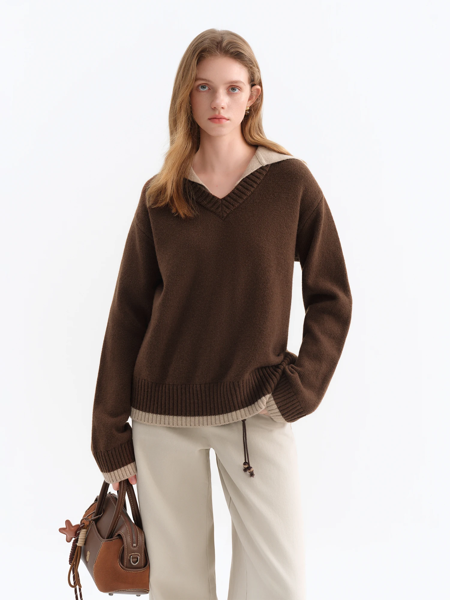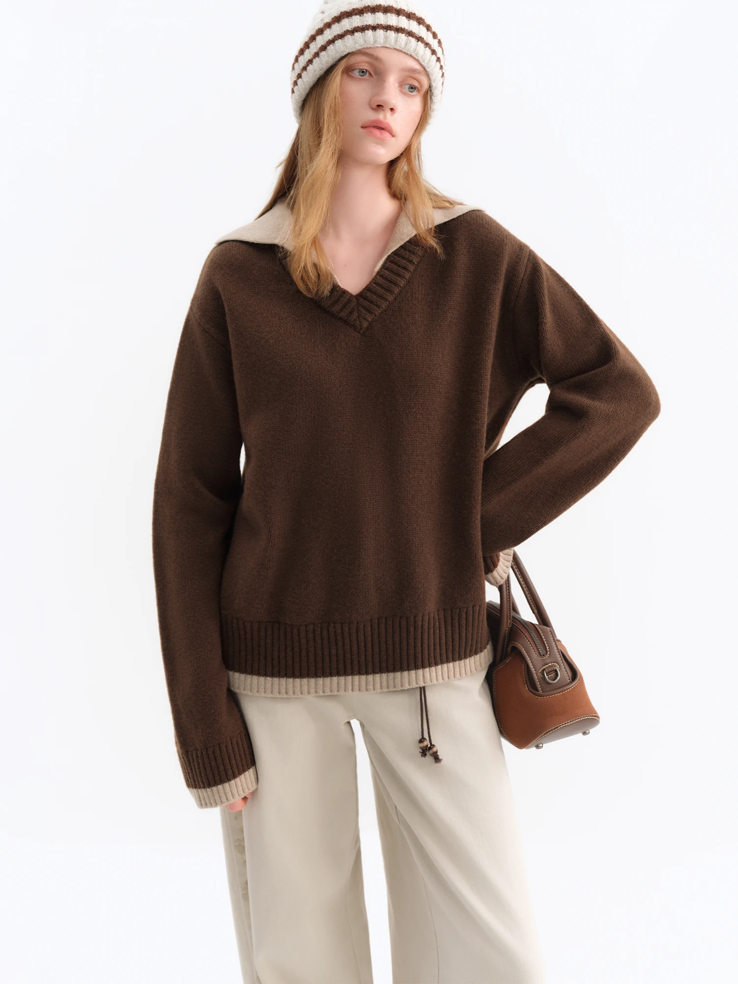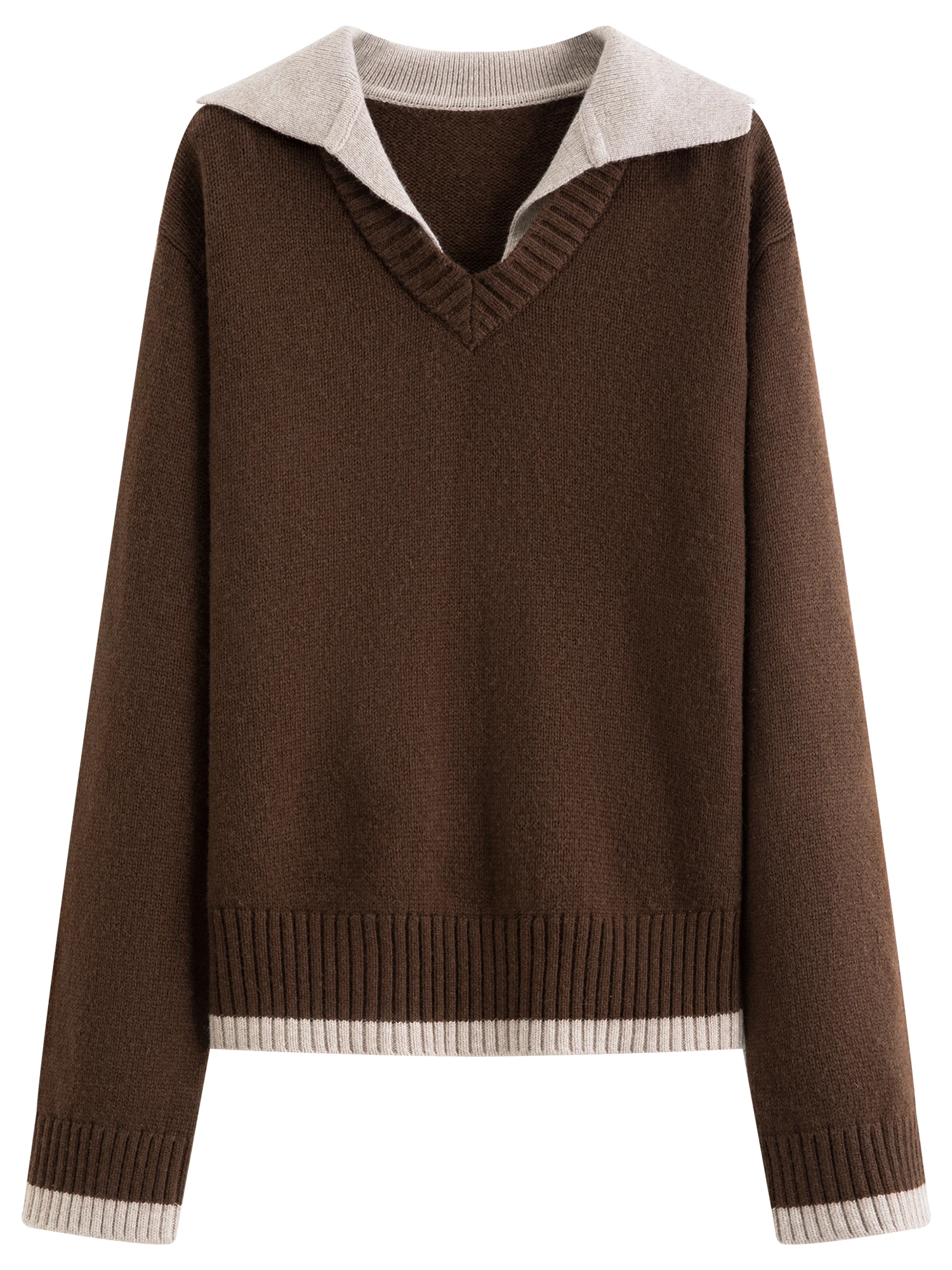 The Contrast Colour Lapel Pullover Sweater is a refined addition to your autumn and winter collection. Designed with the modern woman in mind, this pullover offers both comfort and style, making it ideal for various occasions.