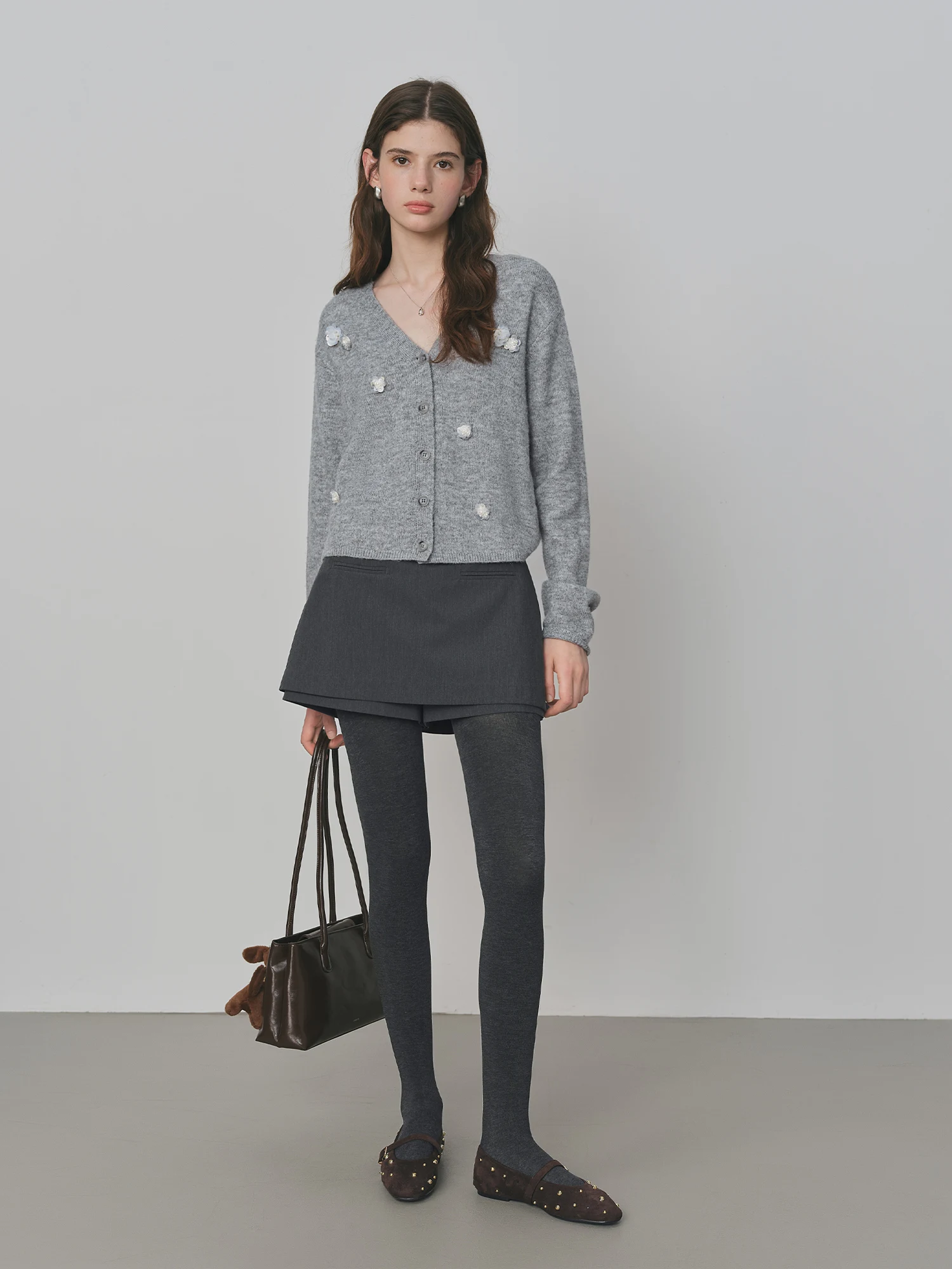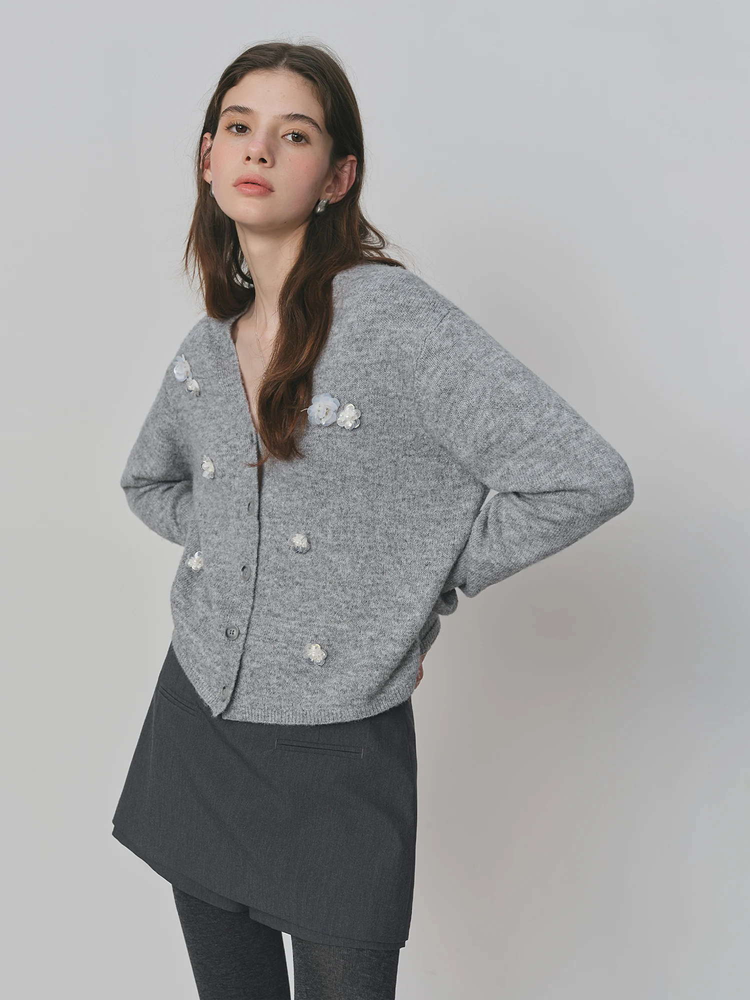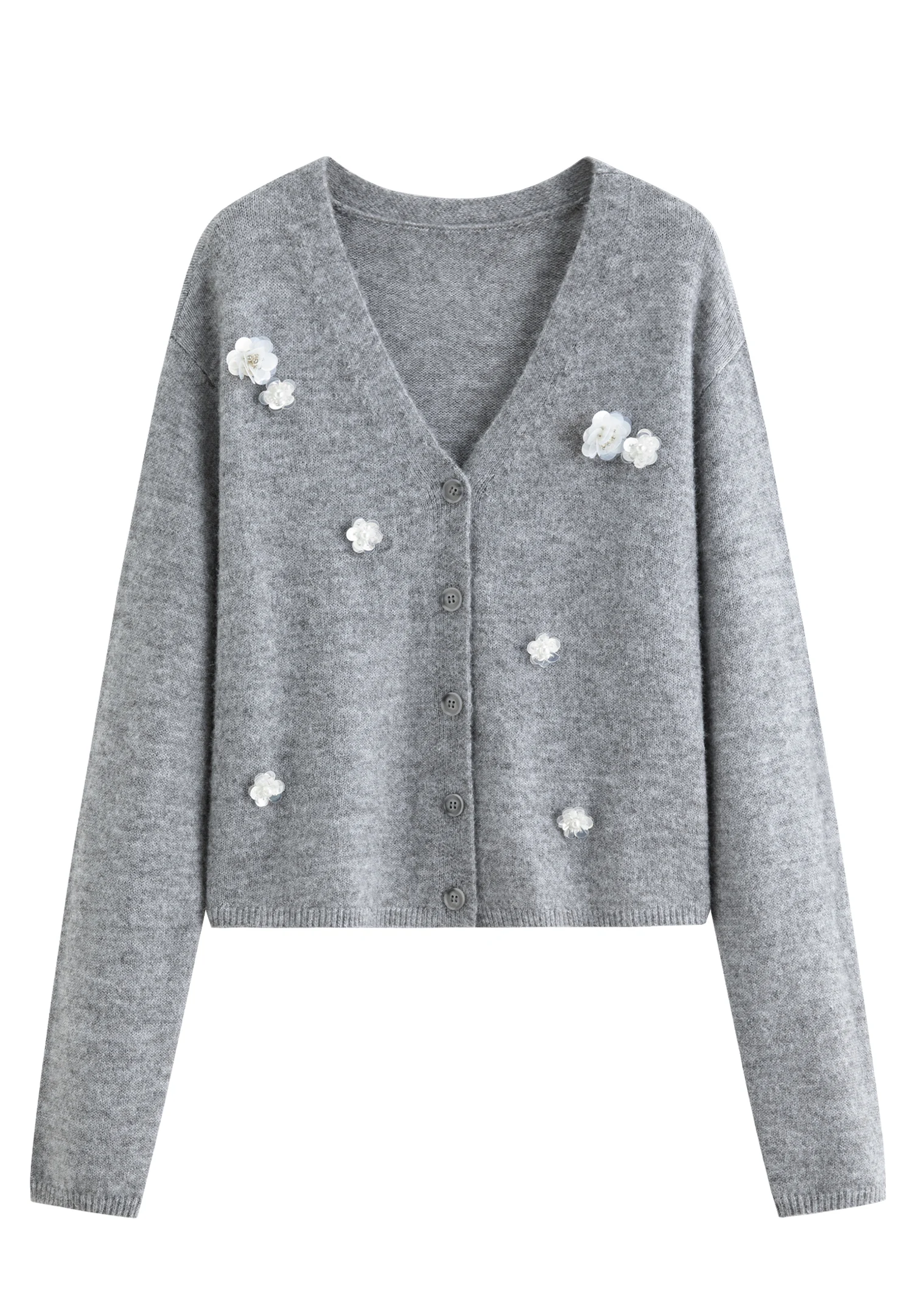 3D Beaded Flower Knit V-Neck Cardigan in Light Grey