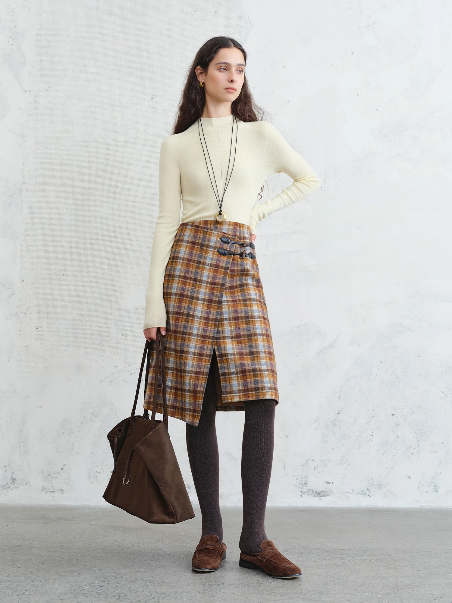 The Vintage College-Inspired Asymmetrical Slit Skirt in Brown Plaid is a sophisticated addition to your office attire. Designed to provide both comfort and style, this skirt seamlessly transitions from day to evening, making it a versatile choice for the modern woman.