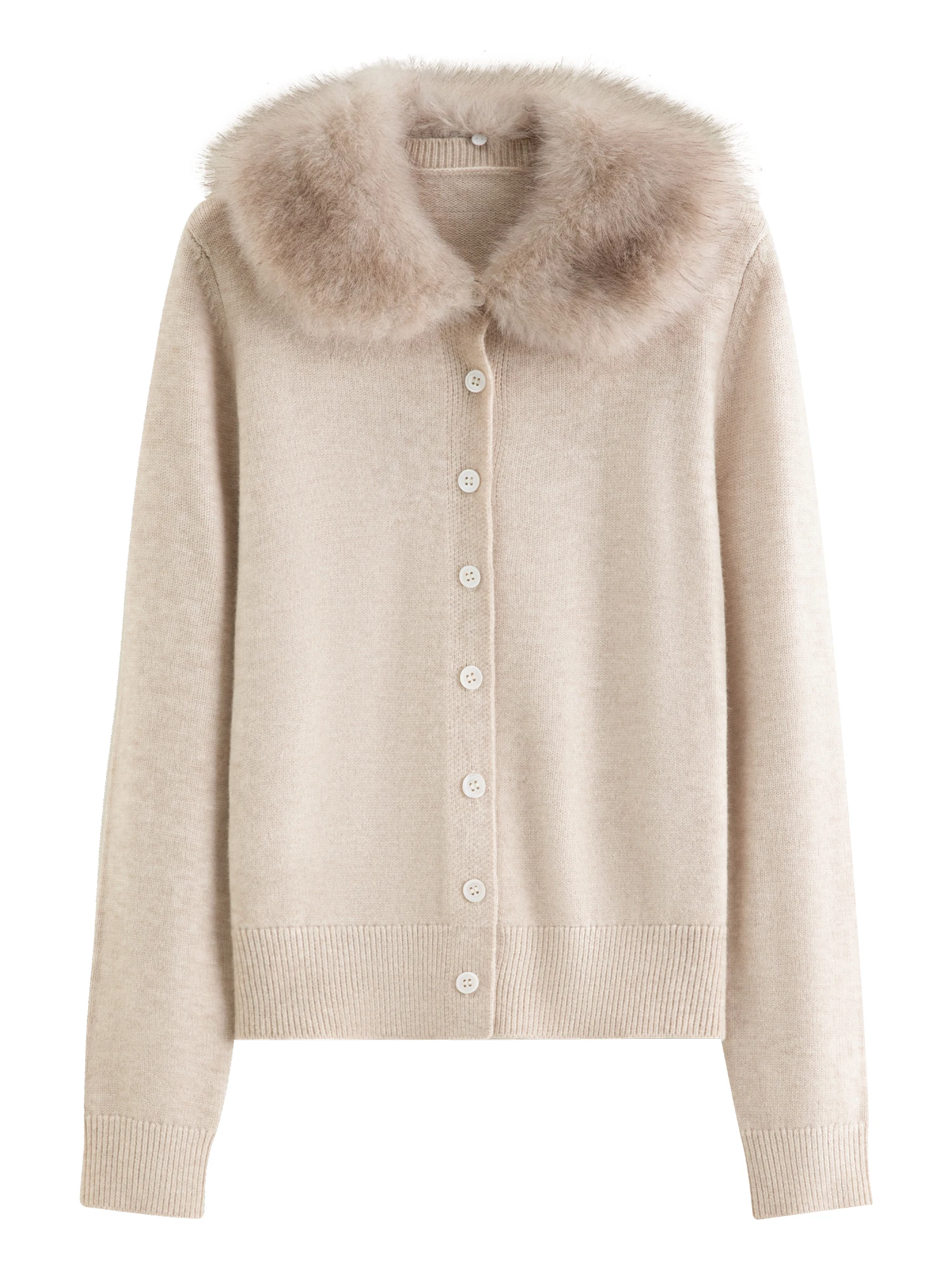 Q: Can this cardigan be styled for both casual and festive occasions?A: Absolutely. Its versatile pale pinkish gray tone and elegant faux fur collar complement both relaxed and celebratory outfits.