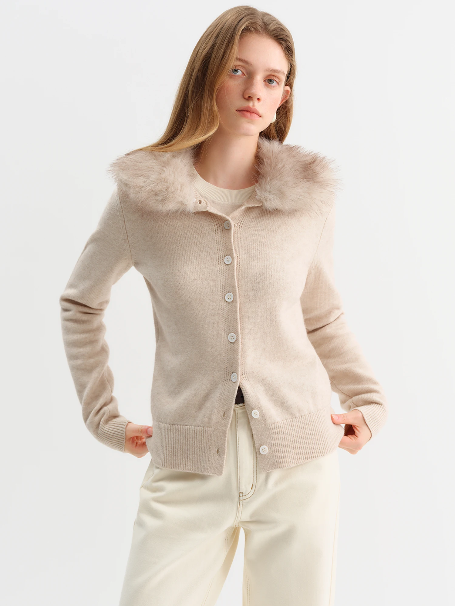 Introducing the Faux Fur Collar Knit Cardigan in a soft pale pinkish gray, designed for the modern woman who appreciates warmth and sophistication during the cooler months. This slim-fit cardigan features a refined V-neck and a single-breasted closure, making it a versatile layering piece.
