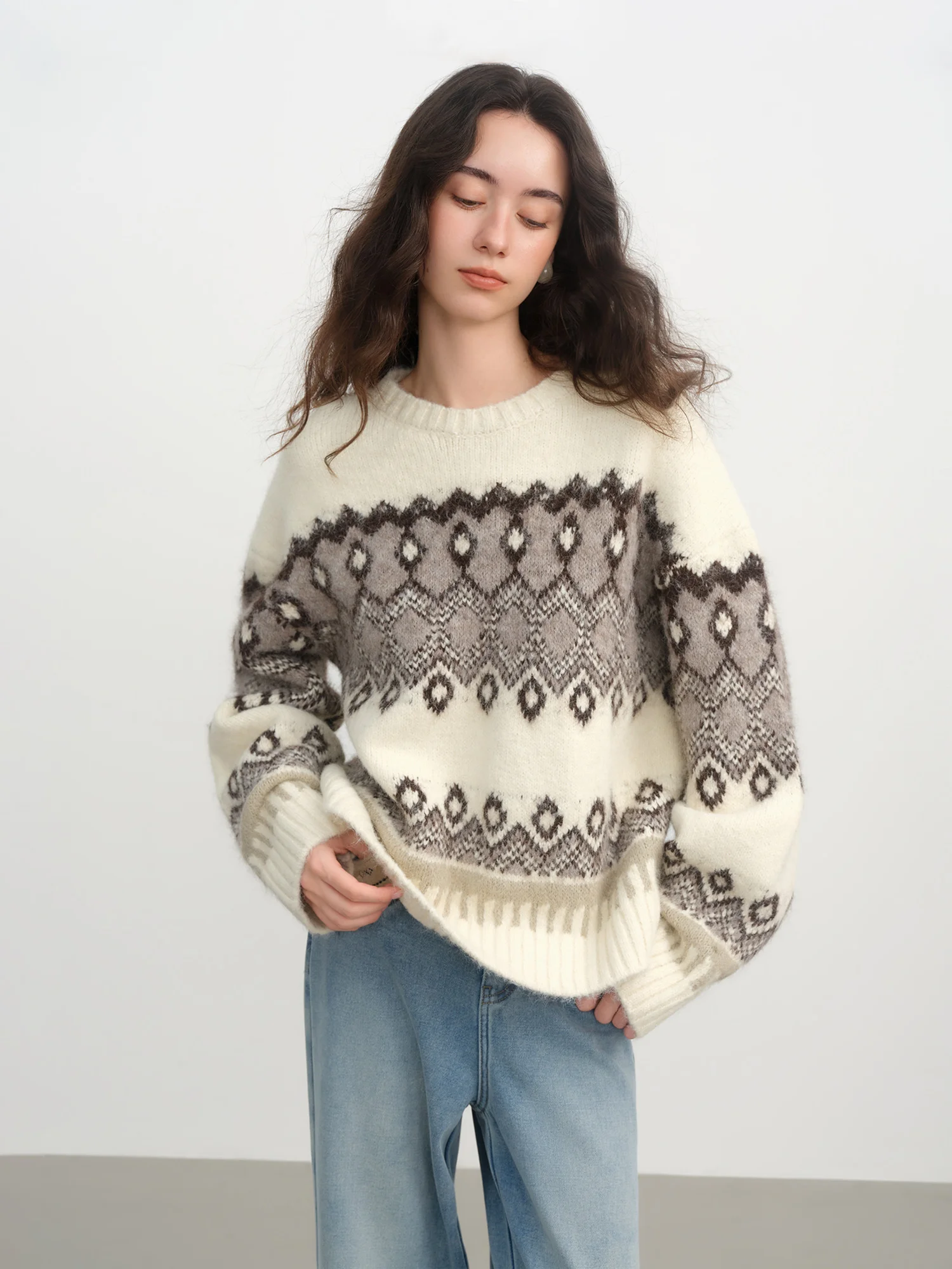 The Floral Pattern Mohair Blend Knit Sweater is an elegant choice for the contemporary woman who values both comfort and sophistication. This loose-fit pullover is perfect for winter office wear and can easily transition to evening outings.