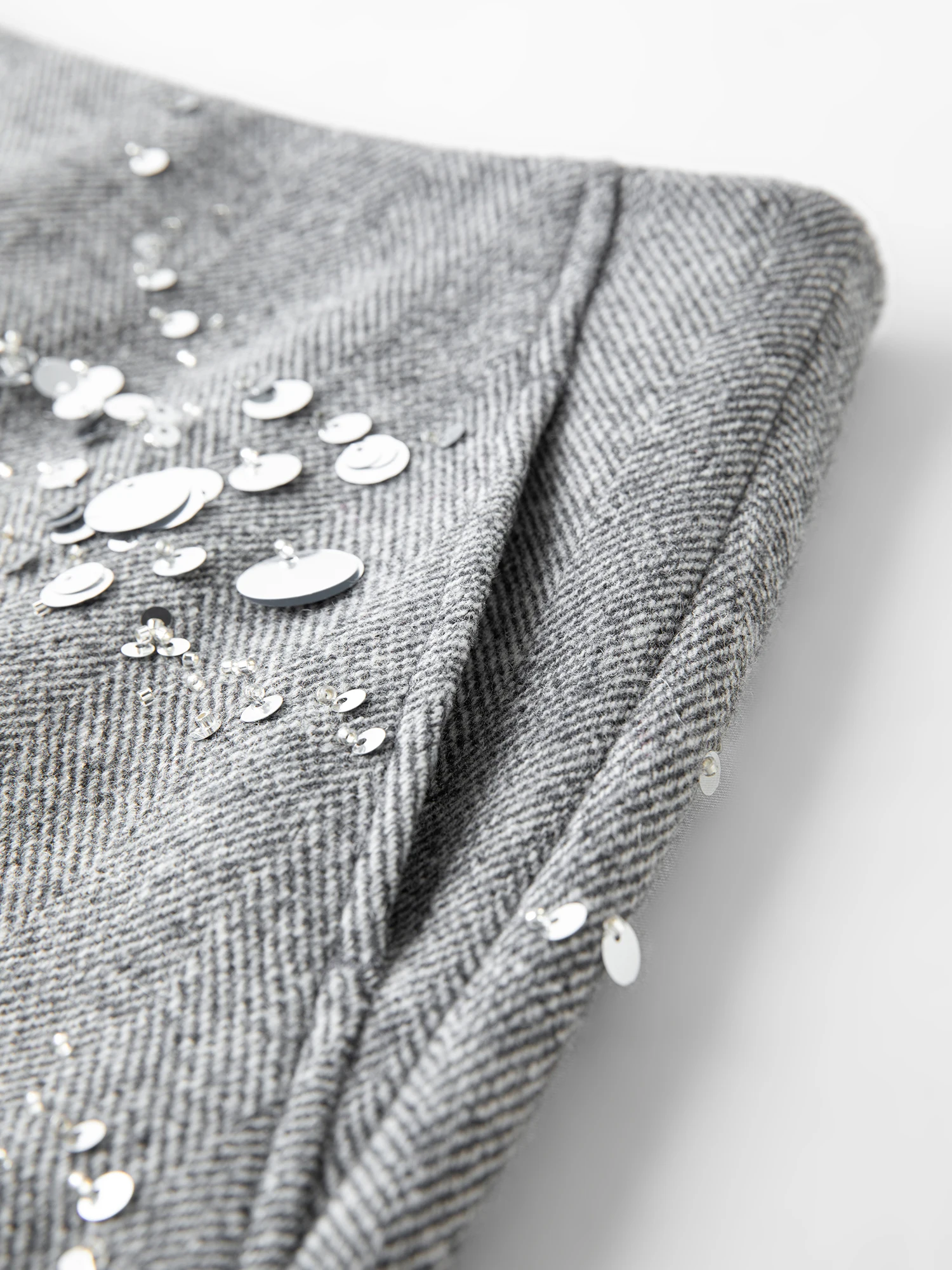 Discover the High Waist Grey Sequin A-Line Mini Skirt, an exquisite addition to your winter wardrobe designed for the modern woman. Perfect for office settings or casual outings, this skirt combines elegance with comfort.