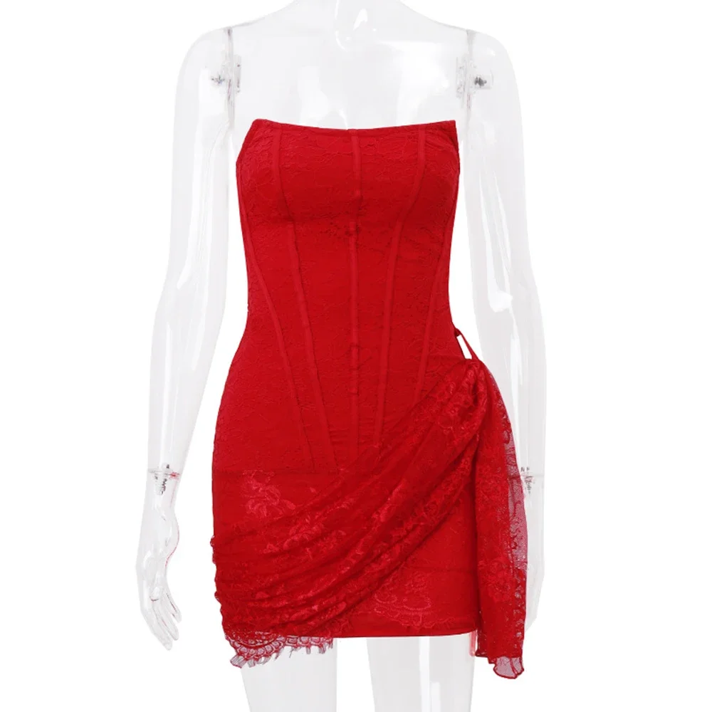 Step into sophistication with this stunning lace dress. Featuring a strapless bandeau design and delicate lace skirt, it beautifully highlights your silhouette. Available in black, red, and white, this mini dress is perfect for spring and summer soirées. Crafted from high-quality polyester, it offers a comfortable fit with a touch of elegance. Perfect for any stylish occasion.