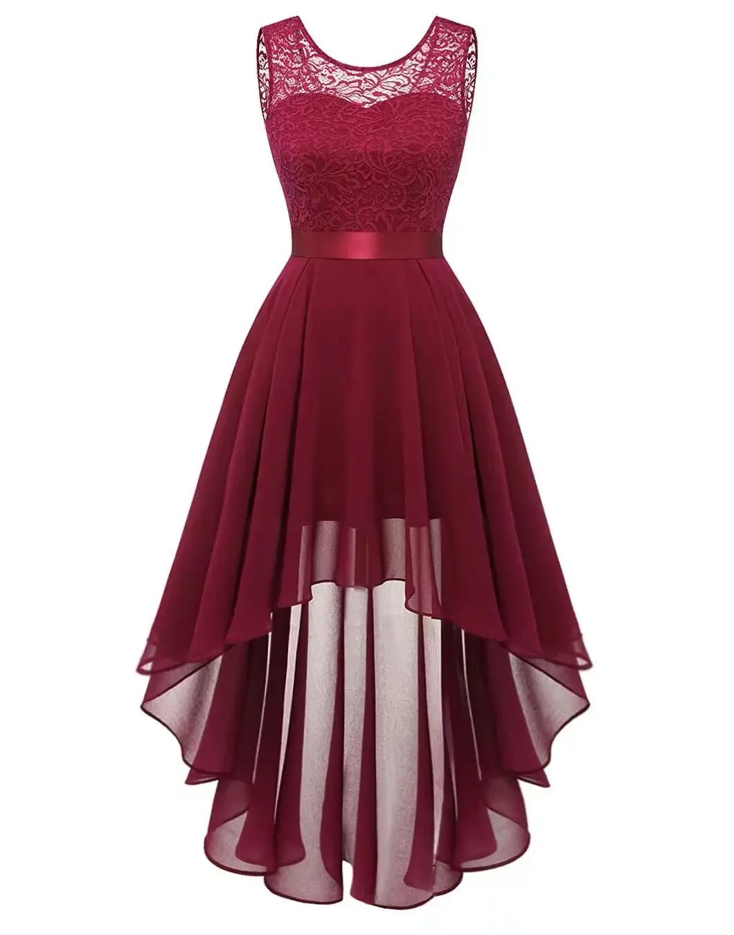 Discover refined elegance with the High-Low Chiffon Lace Dress, designed for women who appreciate a polished yet contemporary silhouette. Crafted from lightweight polyester with delicate lace patchwork, this ankle-length dress features a flattering A-line shape and a V-neckline for a graceful finish.