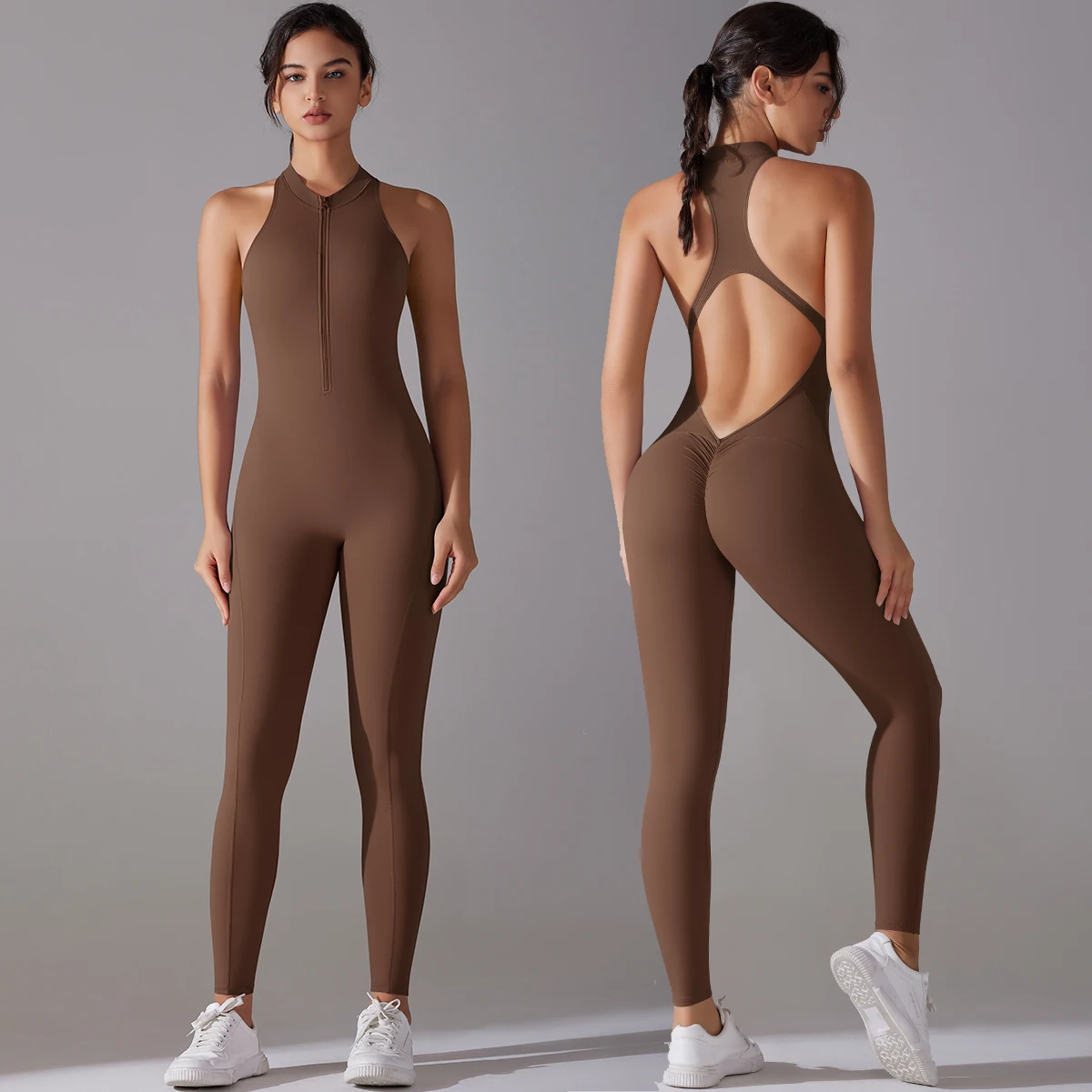 Unleash your inner confidence with this Hollow Backless Scrunch Sporty Jumpsuit. Crafted from luxurious, high-stretch nylon and spandex, it offers a flattering silhouette with a high waist and ankle-length design. Available in an array of elegant colors, this sleeveless piece features a stylish zipper and is perfect for any season. Ideal for yoga, workouts, or casual outings, it combines functionality with sophistication. Embrace comfort and style effortlessly.