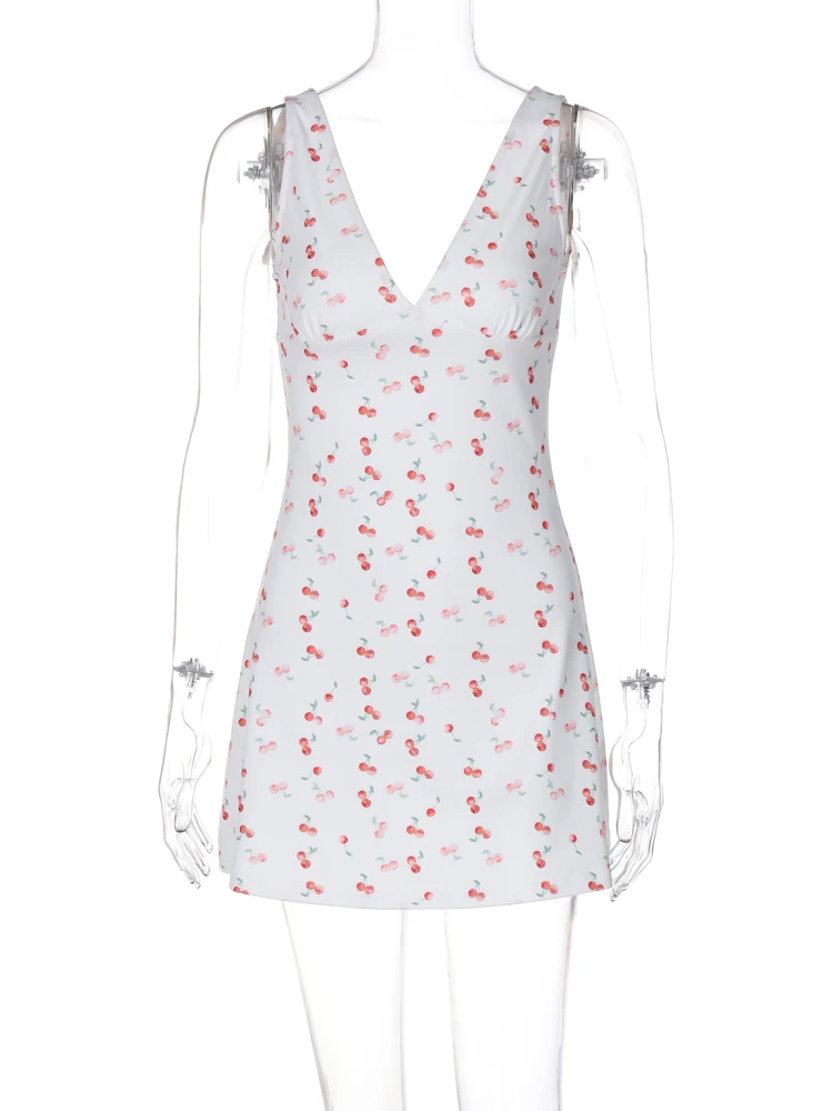 Embrace the essence of summer elegance with the Cherry Print Backless Bodycon Mini Dress, a timeless addition to any wardrobe that promises to make you feel fabulous.