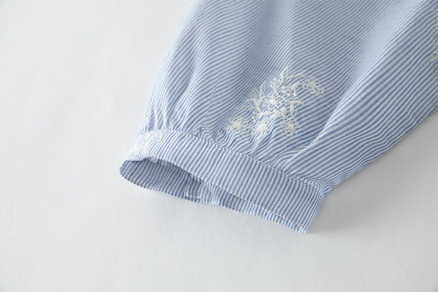 Elevate your summer wardrobe with the Isla Striped Shirt, featuring a stunning hollow back embroidery that adds a touch of sophistication. Crafted from 100% breathable cotton, this casual shirt offers a relaxed fit and a timeless striped pattern. Perfect for warm days, its single-breasted closure and turn-down collar deliver effortless style. Choose the Isla for a blend of comfort and elegance.