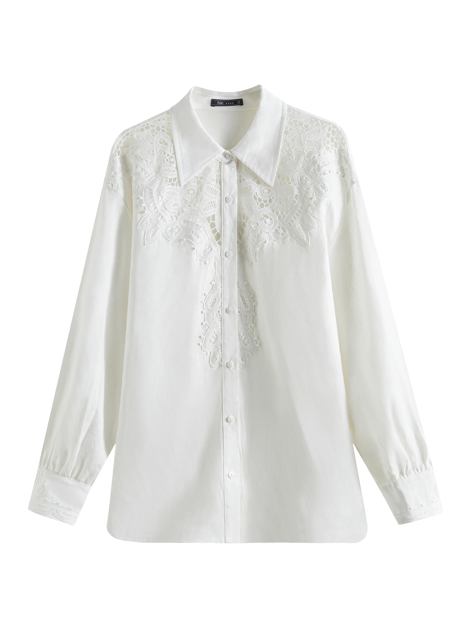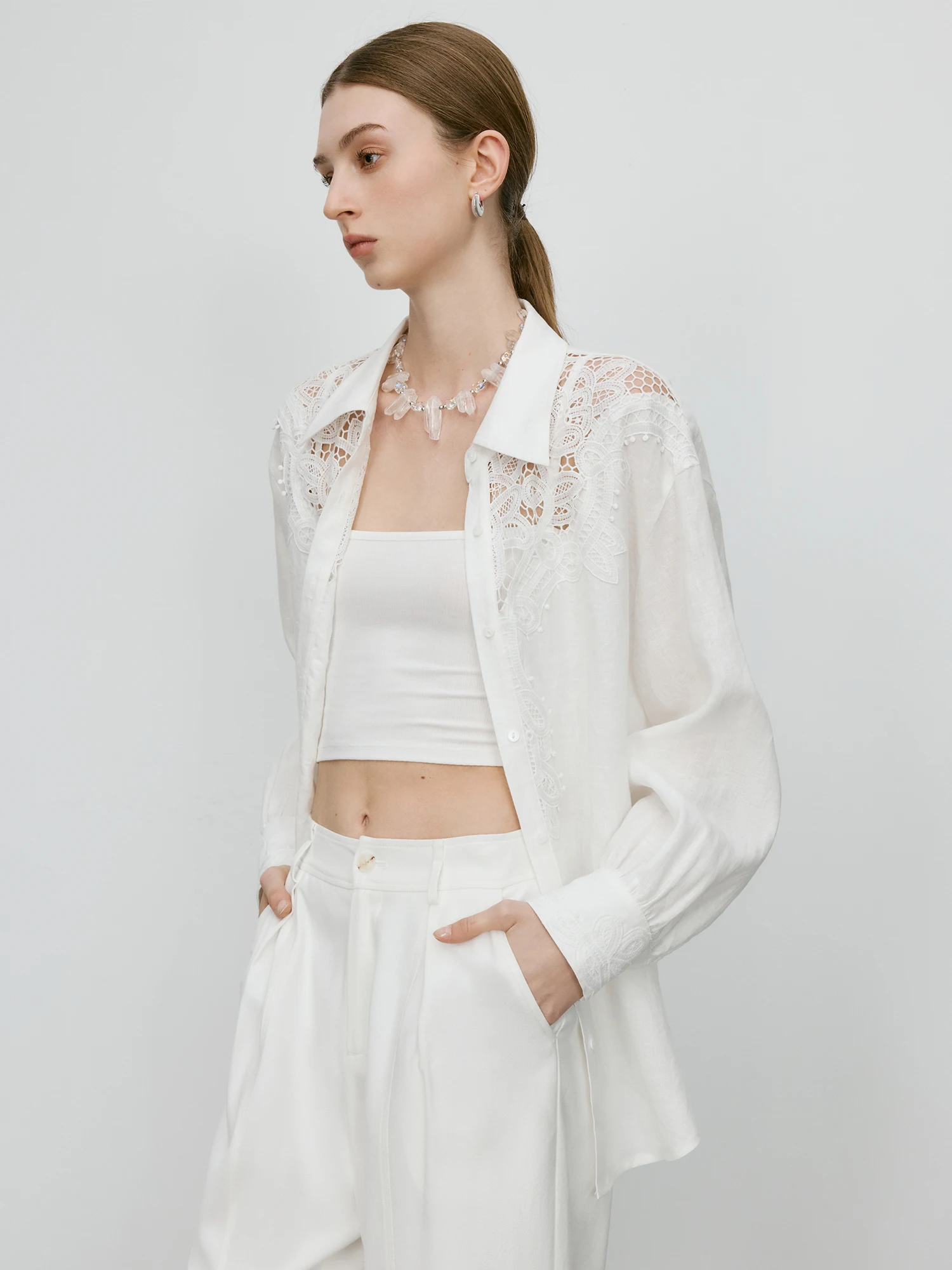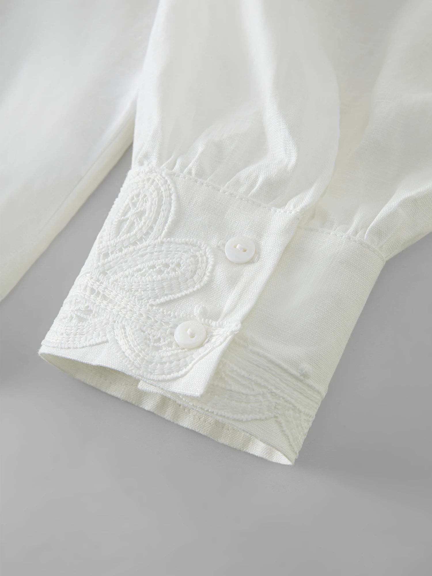 Ivory Linen Lace Long-Sleeved Shirt with Embroidered Detailing