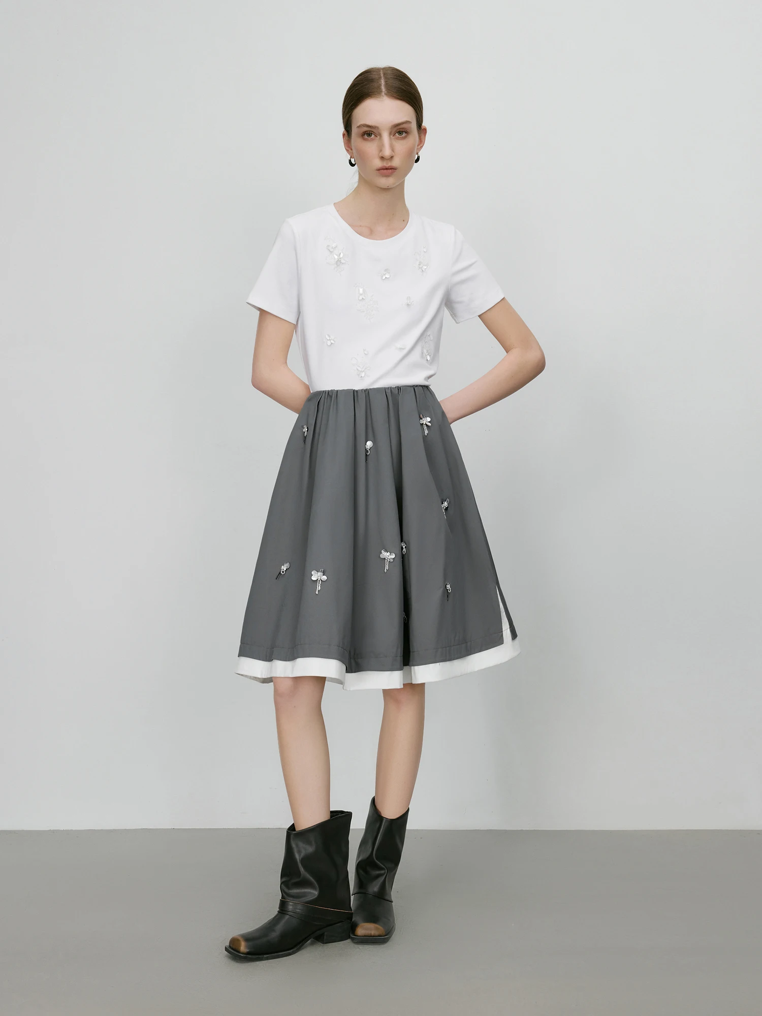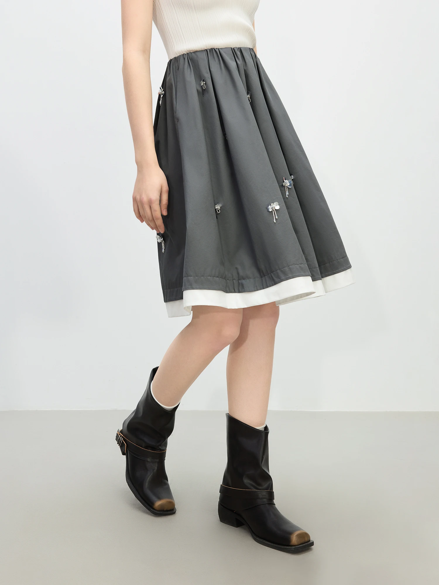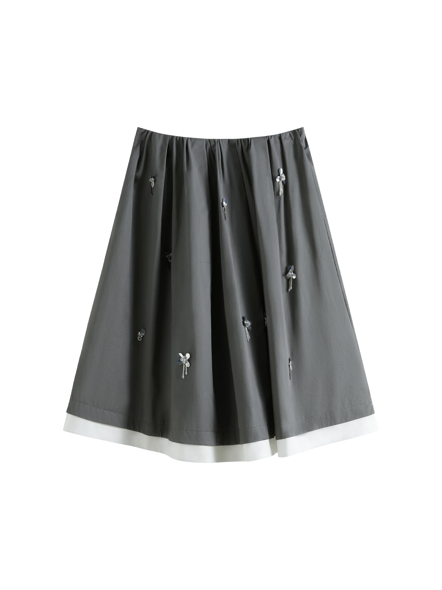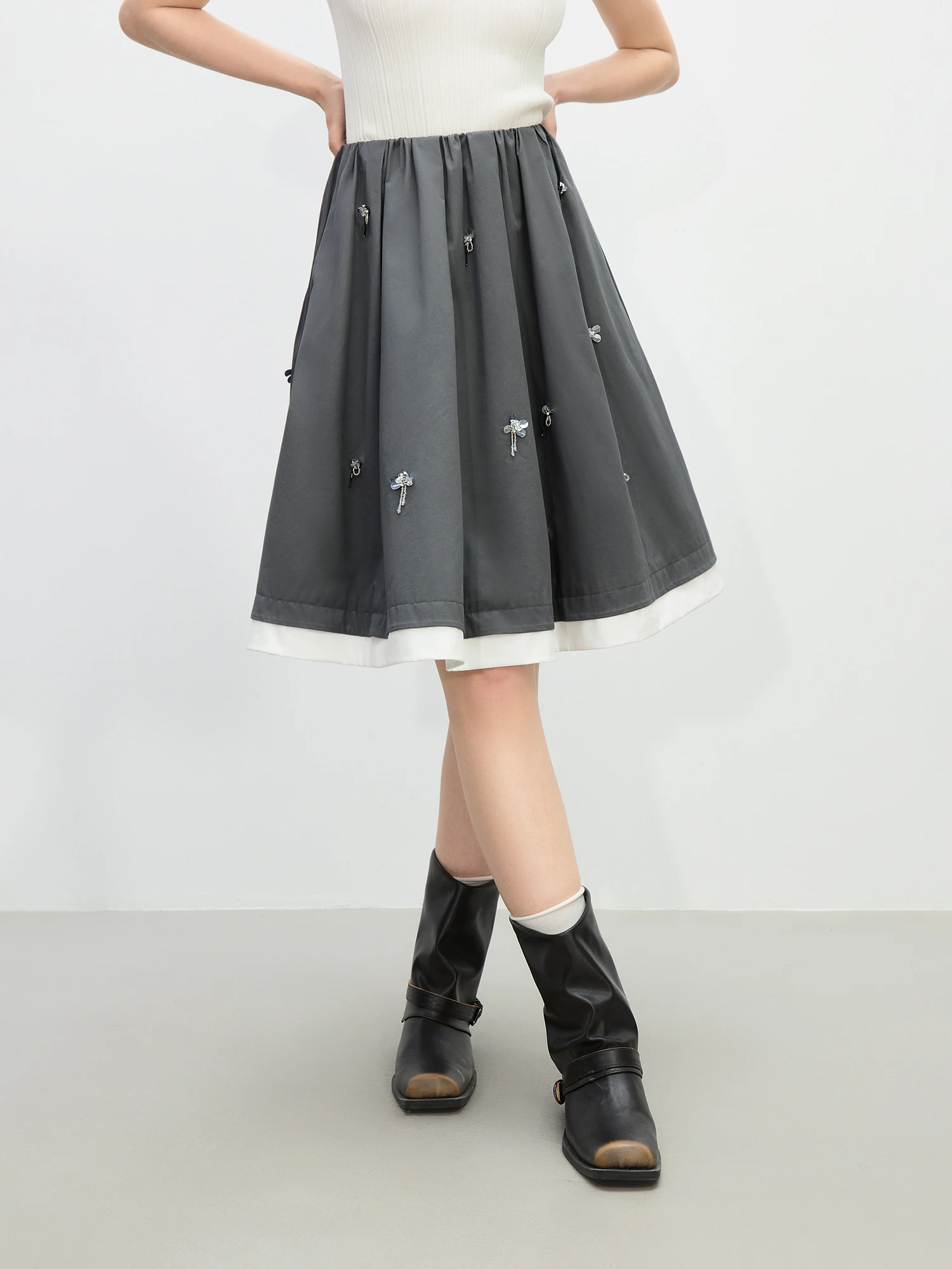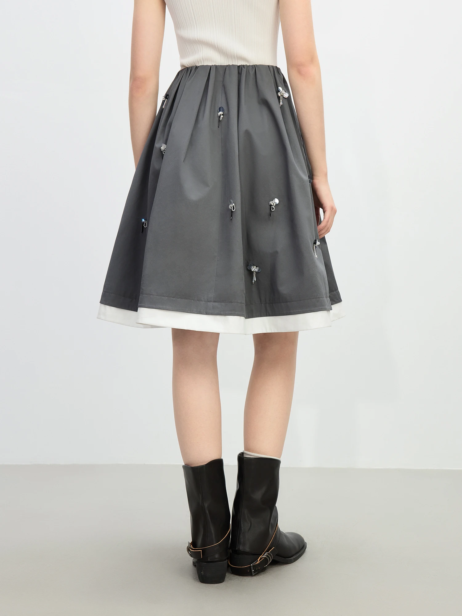Knee-Length Cotton Skirt with Grey and White Patchwork Detail